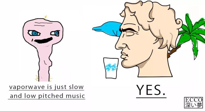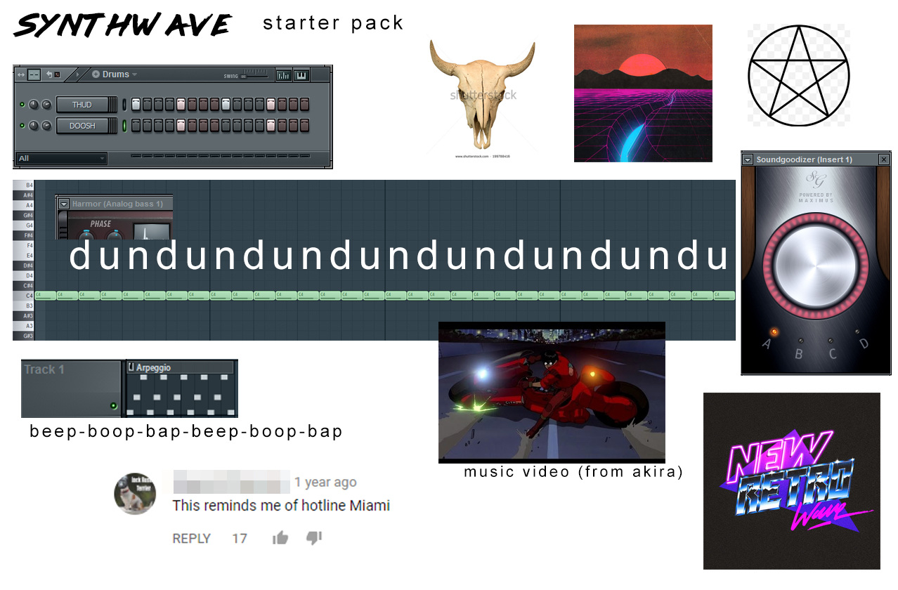 Если не умеешь писать музыку, у тебя нет таланта и интересных идей - используй эстетику и наборы клише в качестве костылей. Не эксперементируй. Не изучай природу жанра и эпохи которую имитируешь. Просто смотри аляпистые картинки на пинтересте и накидывай кучу ебаного говна в секвенсор. Заебашь побольше эффектов поверх: дохуя реверба, шум винила, дилэй. Атмосфера достигнута? Спизди клипарт или сделай примитивную хуйню во взломанном фотошопе на обложку. Шедевр готов? Всё, теперь ты модный артист модного жанра!