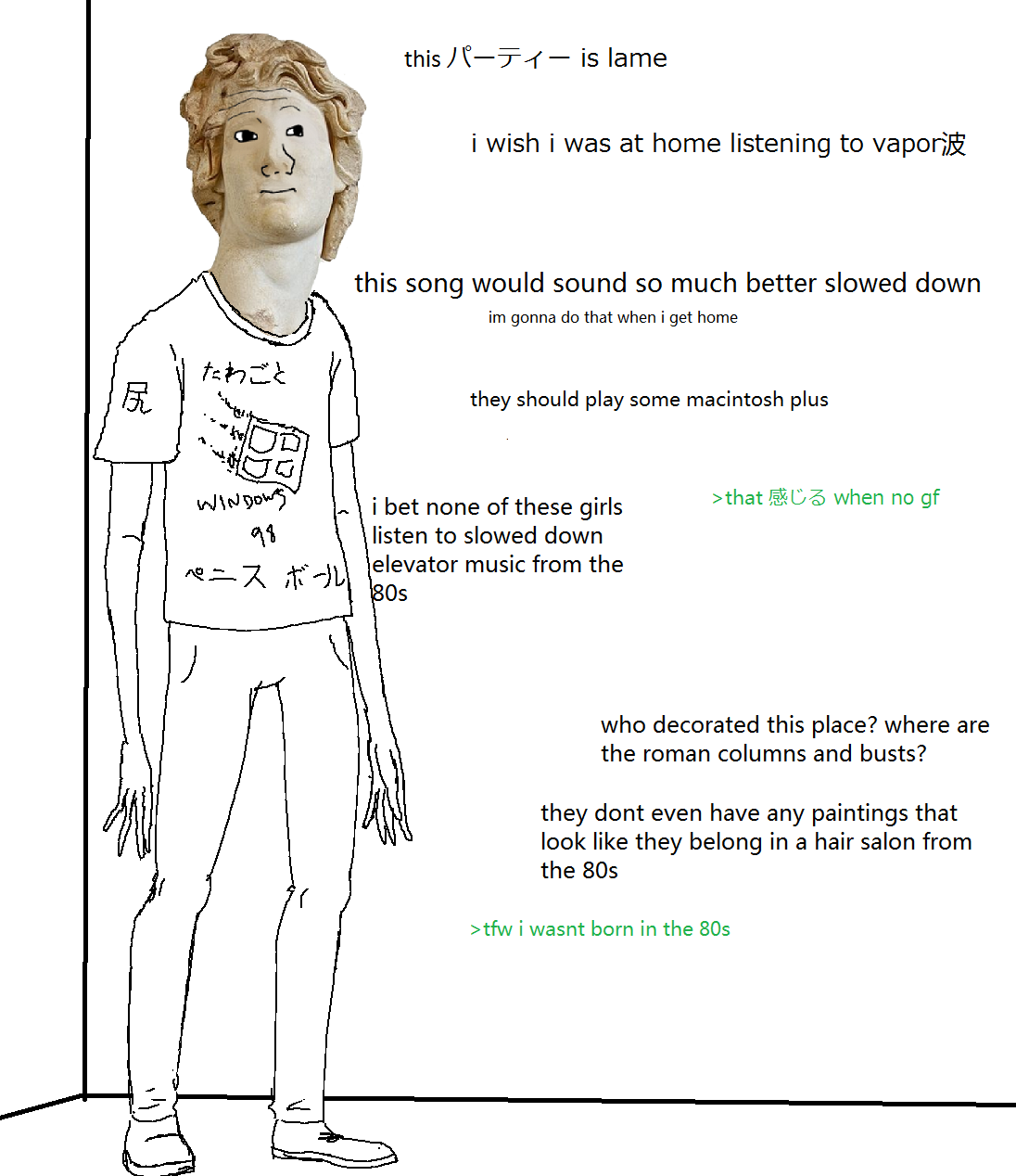 Не, всё-таки в 2024 вапорвейв воспринимается так, будто смотришь контент на странице деревенщины на одноклассниках ру. Видишь, что он постит мемы 10-летней давности и думает, что они новые. Вроде бы даже сам с сочувствием к нему относишься, ведь ты их сам смотрел 10 лет назад. Но всё равно ощущаешь стыд. Мемы теперь выглядят стрёмно, кажутся тупыми. И они давно не актуальны.