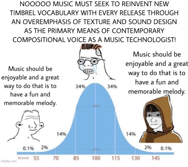 Отсюда мы и имеем эти выебоны какими-то писульками, 5000 заученных драм паттернов (не 4/4!!1 ибо это не умнО а должно быть умнО!!1), дроч на протухшую манятеорию про вторую сигнальную систему (это вообще смех, цепи маркова как когнитивный идеал, даже чатгопота не такая тупая), и постоянные жалобы, что ничего не радует и все какое-то немодное. Да это ты просто понял (не сознательно), что айдием нихуя не статусная музыка, и он тогда стала тебе просто не нужон, етот пердячий айдием!