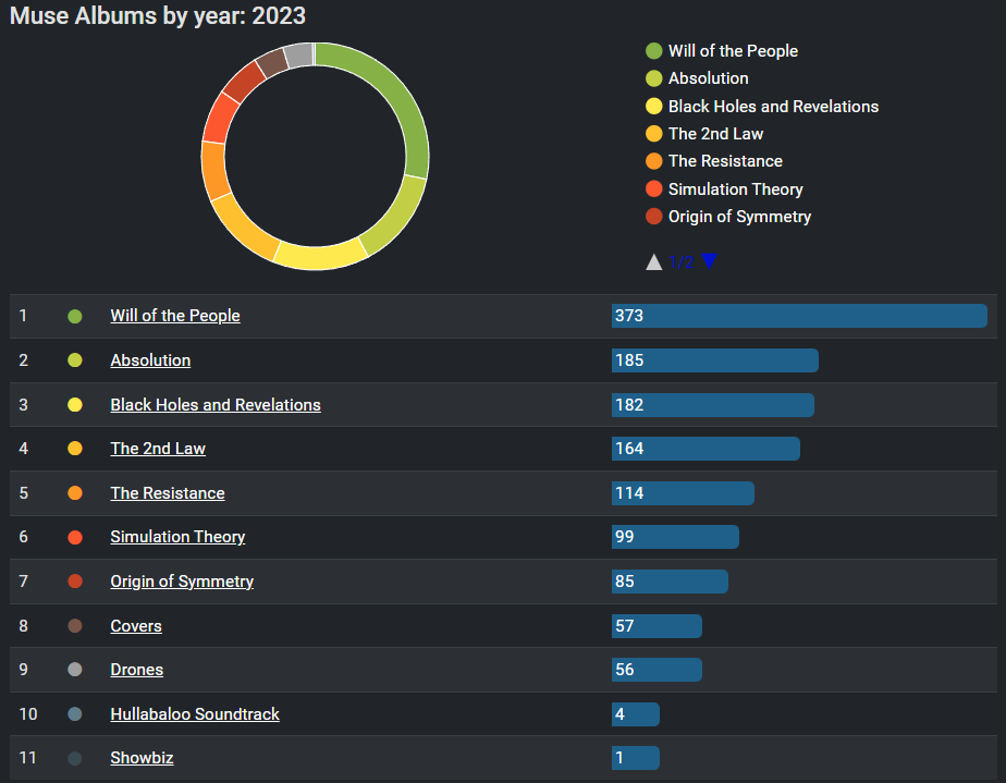 Knights of Cydonia | 9.40 Citizen Erased | 9.30 Stockholm Syndrome | 9.21 New Born | 9.12 Hysteria | 9.10 Map of the Problematique | 8.91 Space Dementia | 8.86 Showbiz | 8.82 Butterflies & Hurricanes | 8.79 Plug In Baby | 8.75 Bliss | 8.73 Muscle Museum | 8.56 Dead Star | 8.42 Time Is Running Out | 8.41 Reapers | 8.31 Sunburn | 8.31 The Handler | 8.28 Sing For Absolution | 8.27 Micro Cuts | 8.27 Assassin | 8.25