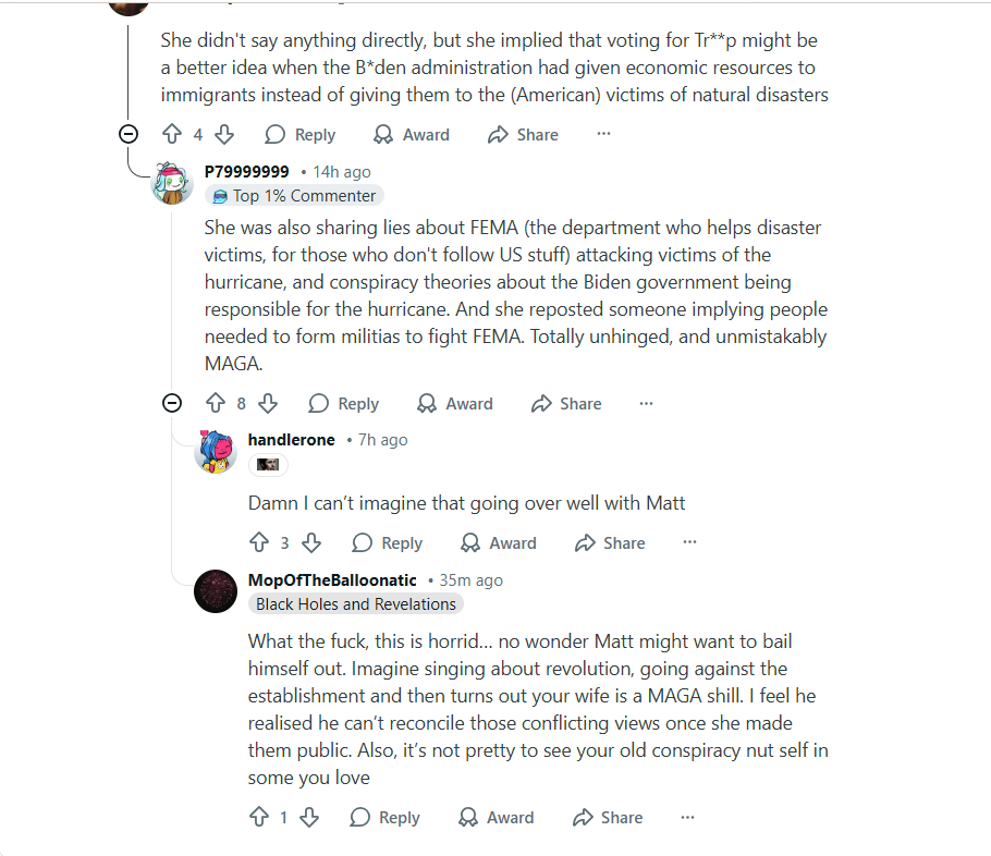 >>1992018 >не согласен с тем что темы мистицизма и конспирологии потеряли актуальность, всё как раз наоборот Дело как раз в этом, они вот говорят, что сейчас не хотели бы находиться среди людей, которые группу любят, потому что тема не потеряла актуальность, но приобрела острый политический заряд, и по их мнению вот эти люди, любящие Мьюз это неироничные радикальные шизики, с которыми в одном поле срать не сядешь. И это не только их мнение, посмотри на любой обзор Фантаны, на его великолепное MUSE SUCKS видео. Хрен знает почему они на этом так зациклены, никто ведь не говорит что сериалы вроде Stranger Things или Мистер Робот, целиком пропитанные такой же овер зе топ конспирологией, это продукт праворадикальной или еще какой повестки, это же бред. Но там у них не только в этом дело, они еще говорят про то что Мьюз сейчас "невозможно слушать" потому что рок умер, а они притворяются что нет и отыгрывают эту большую зрелищную рок группу устаревшего формата. И это уже поинтереснее претензия, типа, а что надо делать, что играть, куда податься? Они же пытались вписаться в зейтгейст, не так радикально как Колдплей, но все же, тот же Madness был вполне успешен, не являясь роком, ST вообще можно назвать электропоп альбомом и тд, что еще надо было делать-то по их мнению? Энивей, все эти причины почему "уже не то" кажутся надуманными, но мы тут еще тредиков через десять-пятнадцать придем к истине и всем расскажем, не переключайтесь