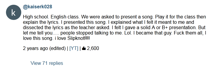>>1989084 А мне по нраву Three Dollar Bill, Yall$ и Korn, вот где реальная мазафака зарыта. Но лучший саунд и коммерческий успех у Korn естественно на Follow The Leader, потом группа уже никогда не достигла той высоты. К Slipknot вопросов нет.