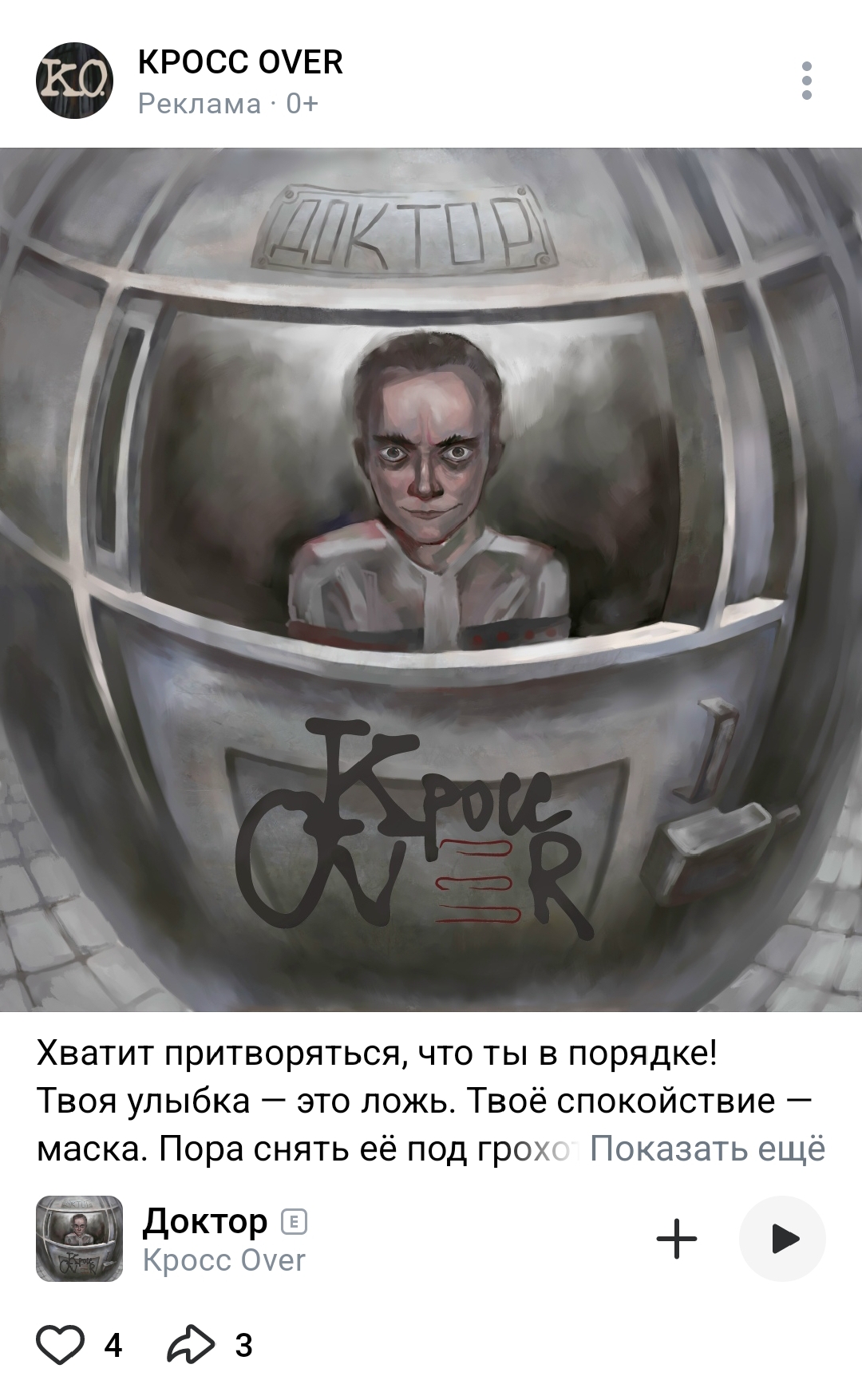 В ВК меня атакует агрессивный таргет - какая-то нью-металл группа с 700 подписчиков. Песня про доктора и палату. Кринжатина жуткая. К сожалению, не сохранил картинку с песни - там ебло с выпученными глазами смотрит из окошка больничной палаты. Не удивлюсь, если парни из этой кринж-группы сидят итт.