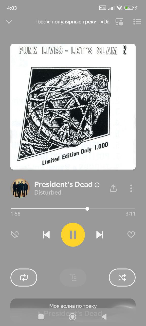 Бля на днях лазил в Яндекс музыке, и случайно обнаружил что на странице disturbed (моя любимая группа) появились треки которых раньше не слышал, и действительно, голос другой, жанр другой, но два трека у музыканта в подборке есть. Перешёл на альбом который указан в Яндекс музыке, дата указана 1953, что вообще лишено смысла так как там панк рок. На русском вбивал в гугл, ничего кроме уже известной группы, но вбив на английском, оказалось, что это треки панк группы 80-х THE disturbed из глазго, а треки из сборника местных панк групп. Очень интересная находка однако, один из треков даже зашел. странно что я.музыка добавили эти треки к другому музыканту. в двойные странно что на той же я.музыке так же есть группа the disturbed которая вообще ничем не связана с первыми двумя и играет в другом жанре. Просто показалось интересной находка и захотелось поделиться, так как о данном факте я думаю мало кто в курсе