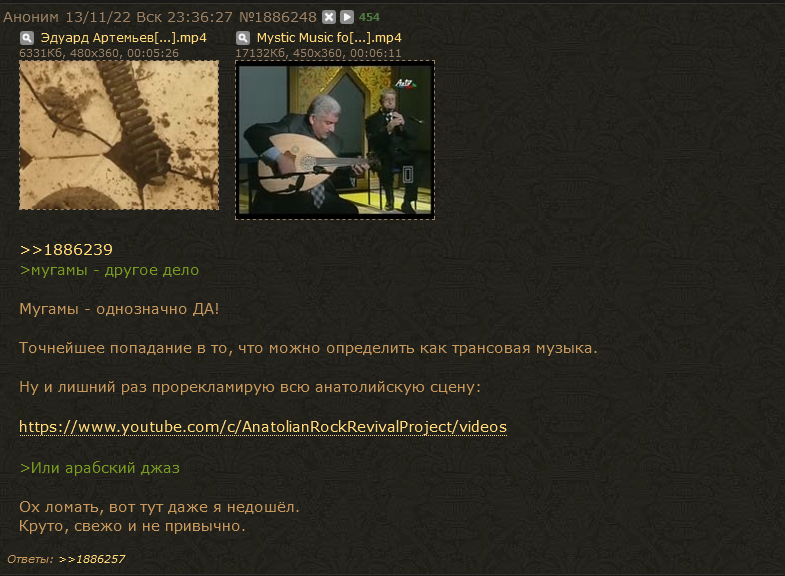 >>2000541 >вдохнули жизни в анатолийсий роцк Это были Altın Gün, дебич. >они переоткрыли западному миру удобоваримую нормисам микротональную музыку Похуй/поебать и на микротональники, и за западный мир, пока ты вместе с нормисами от Кустарда Ретарда тащился, я арабский джаз слушал.