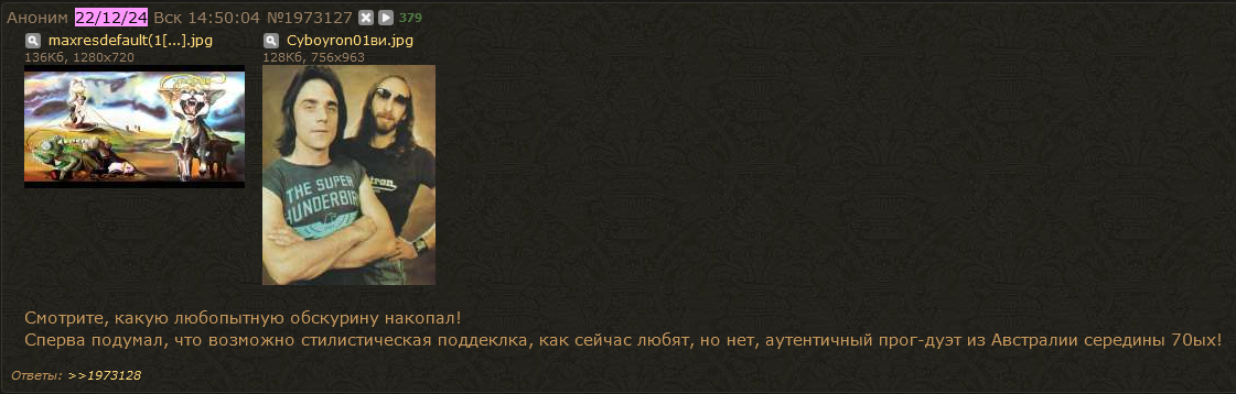 >>1995610 >очередная плесневелая залупа, которую все, кроме только вкатывающихся в прог, давным-давно обоссали Мое мнение такое, что хочешь мнений - пиздуй на прогархивы читать рецензии. Сюда притаскивай че-нить новое или более обскурное, у чего рецензий на Прогархивах нет, тогда будут тебе мнения. Может быть.
