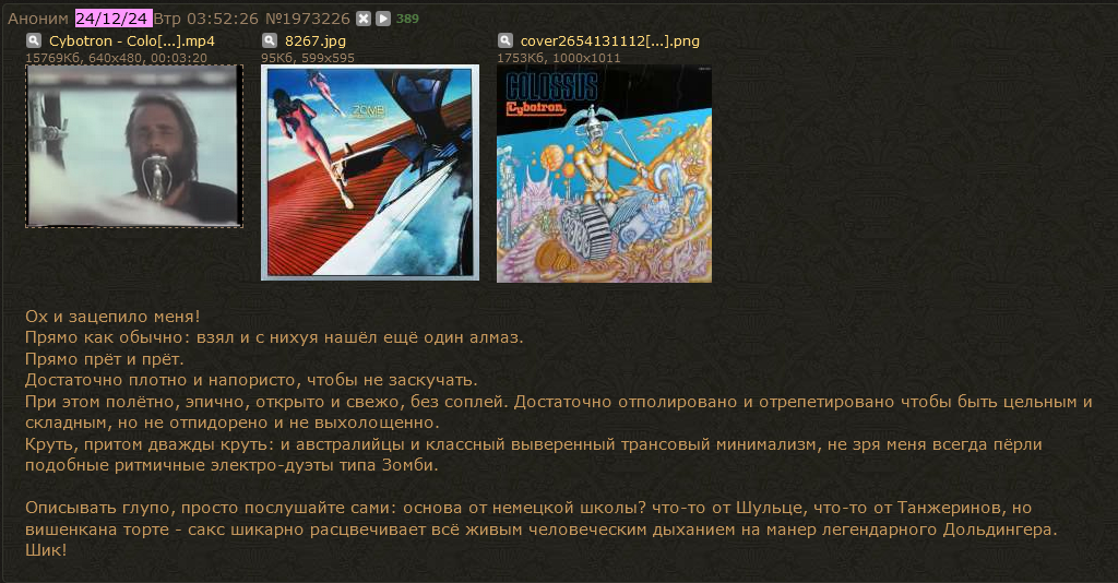 >>2000712 До Дюны добрался, третий день подряд слушаю, хороший, понравился. И у меня вопрос.. а что только Берлинская Школа есть? Другие Школы на основе прогрессива и синтеза не появились? Мимототанон