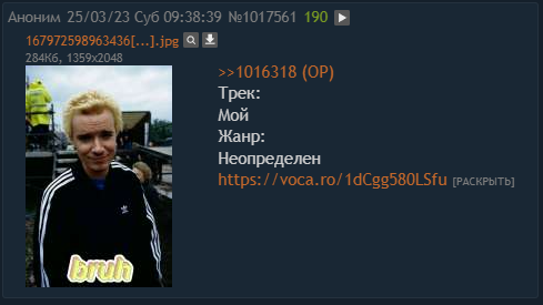 >>1099638 >Вот это чёта-там сейчас является попсовым стандартом. Тебе любой школьник-рэпер пояснит за лэйринг драмсов. Металика тут при чем? >и их новаторские техники звукозаписи переняли все, кому не лень. А их ли это техники? И леееринг до них был, да и ревер очевидно не они изобрели. Их саунд повлиял в целом на звучание постпанка и их многие копировали, но типа кто не играл пост панк, тот очевидно и к звучанию джой дивижн никогда не стремился. Алсо есть мнение, что за всеми этими интересными звуковыми текстурами просто пытались спрятать слабый исполнительский уровень. Партии инструментов незатейливые, да и сыграны кое как, вокал тоже слабенький. И возможно именно поэтому к такому звуку и стремятся всякие школьные инди группы. Неумение играть перекрывается просто звуком, который сам по себе прикольно звучит >Казалось бы метал-группа, НО при записи использовали ситар. А то металика ситар никогда не использовала, да? Охуеть инновация. Да этих ситаров у кого только не было https://www.youtube.com/watch?v=Z-cEyiM9adE >И если ты начнёшь слушать музыку, а не дрист в микрофон, то поймёшь, что музыканты вообще любят таким заниматься Ну какие то музыканты делают ставку на одни вещи, какие то на другие. Какие то дрочат эффекты и выебываются со сведением, какие то просто пишут как есть используя минимум эффектов и технических ухищрений и все равно звучат пиздато. Я не понимаю, почему тебе кажется, что все должны звучать как джой дивижн. Не самый интересный звук в принципе.