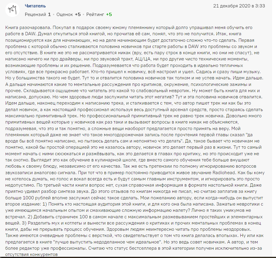 >>1131180 > А теперь на прочитай, что охуенная книга, и что для новичков просто идеальна Так там парень утверждает что музыкант и купил племяшу чтобы не заебывал его просьбами научить музыке, а когда сам прошелся по ней, то не понравилось и расписал огромный пост что ему не понравилось. А не просто "мгм книга говно". На такое я бы конечно внимание не обратил