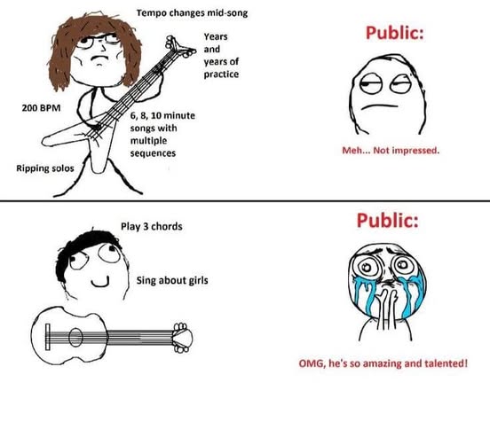 Меня заебало нахуй, только у меня начнет что-то получаться на гитаре, так мне ютуб подсовывает в предложку какого-нибудь задрота, от которого у меня очко на орбиту улетает, ловлю дизмораль и не беру гитару в руки неделю.