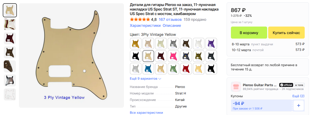 >>1100586 → Короче, я купил их из интереса, оказались неплохие, гладкие края как на фендере, а не грубые как на фигне с алика. Хотя пластик вроде одинаковый, вырезают их очевидно по разному. Держу в курсе.