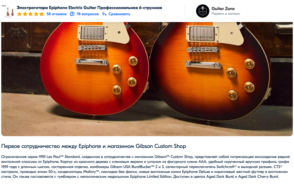 >>1102632 Как нахуй развёрнутый отзыв? Про тона дерева? Просто хорошая гитара. То что лучше звучит, чем то говно с ноу-гейм хамбакерами, с которого когда-то начинал - это 100 процентов. С настоящим гибсоном 59-года возможности сравнить у меня не будет.