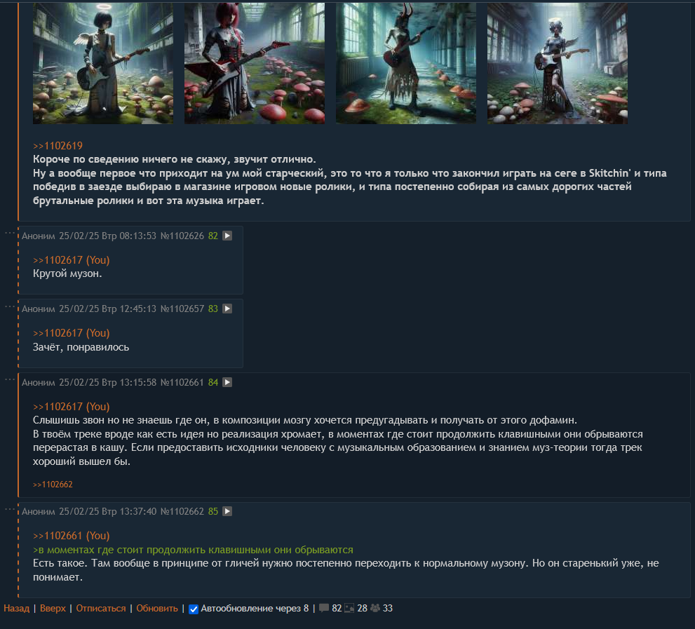 >>1101842 Вот ты рофлишь, а я реально когда-то ссался скидывать сюда треки, а если скидывал, то потом трясся всю ночь. Но потом мне на музыку стало похуй, начал сюда скидывать лютое говно, которое за 15 минут сделал пока жрал, просто ради любого фидбека, мне было забавно, что мое говно кто-то послушал, а если обосрал, вообще похуй, я же спецом говно скинул.