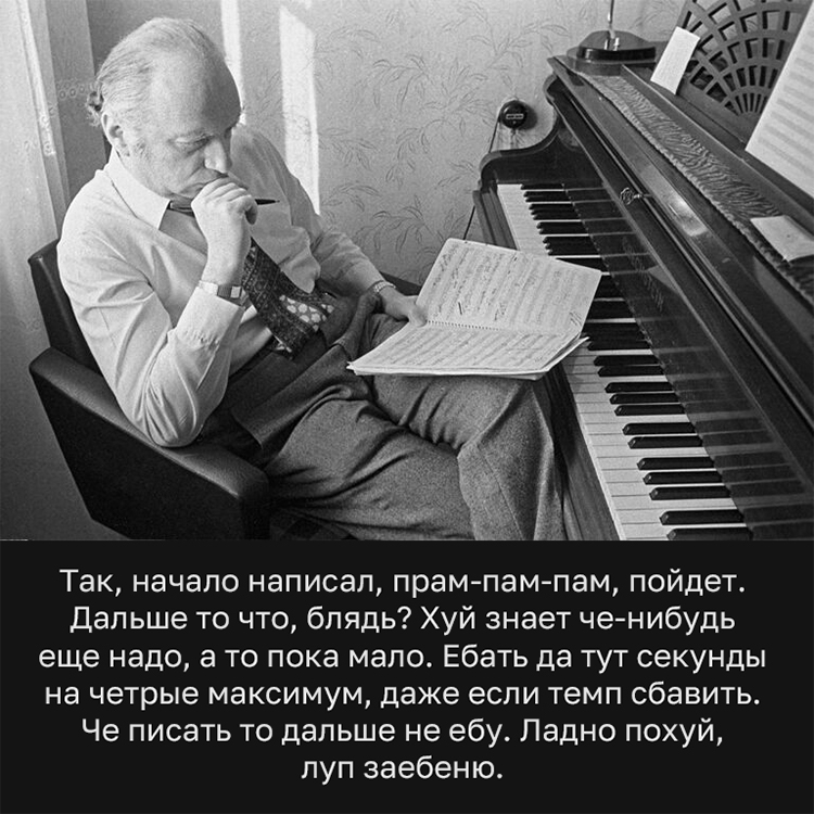>Мелодии это неинтересно, это залупа, это писать умеют все. >Дохуя кто может написать мелодию. Да почти любой. И тут все от Соловьева-Кумача и Раймонда Паулса до Николаева и Дробыша: ну да, ну да, пошли мы нахер