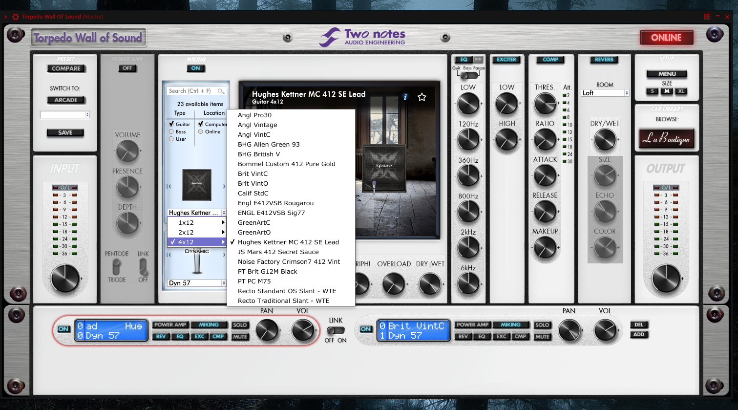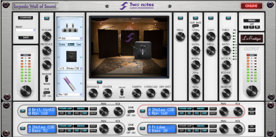 Может кому пригодится. Недавно открыл для себя интересный вст плагин torpedo Wall of Sound от две ноты. Этот плагин в урезанном виде идет в комплекте со звуковухами аудиент не знаю правда есть ли на трекере. Если у вас есть преамп или бас гитара и не хочется возится с кучей плагинов или перебирать импульсы то самое оно, тут и срезы частот есть и имитация оконечника, компрессор, ревер и эквалайзер плюс куча пресетов. Я правда для этих целей использовал всегда ампбокс от меркуриал, но там нет басовых кабинетов а с импульсами возится не хочется. Правда в промо версии всего 8 кабинетов.