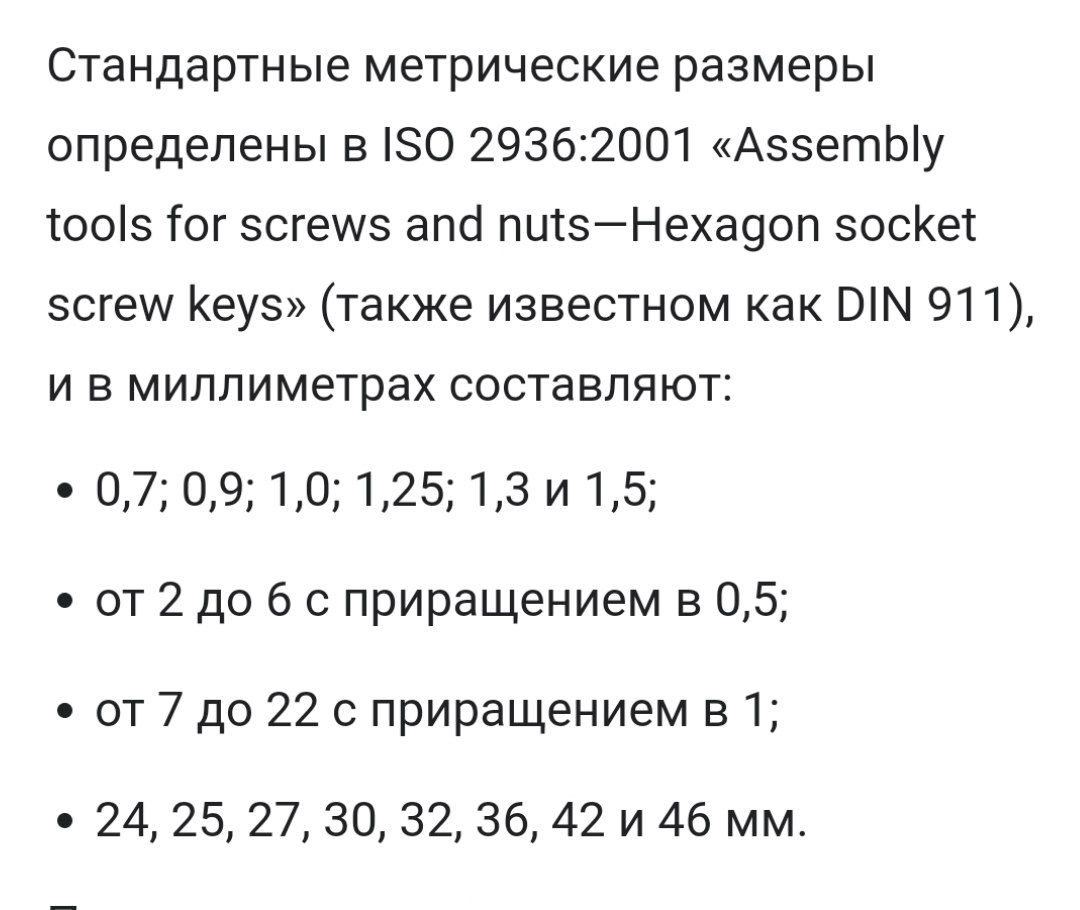 >>1106813 >Не знаю где ты на 1.1 нашёл Я сам не помню... Просто у меня есть несколько этих шестигранников уже лет 7. Сходи в магаз. Помню, когда мне понадобился нестандартный шестигранник для анкера, то я пошёл в магазин, где продавец вынес мне большой пакет, в котором было штук 50 разных шестигранников, и там оказался подходящий мне.
