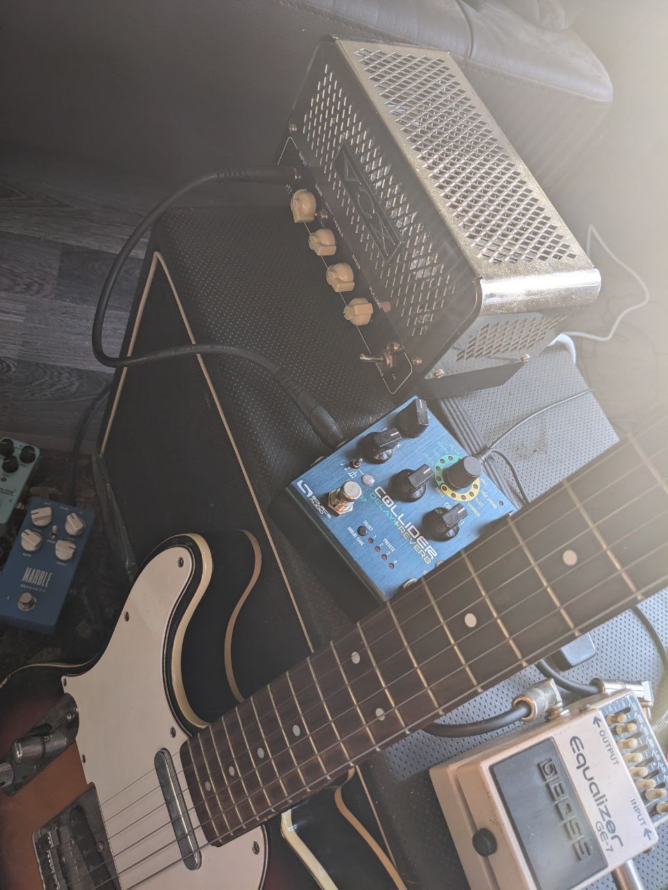 >>1114023 Проц с 1 педалью и накрученными 10 пресетами под педаль воткнут в аудиинтерфейс с плагином, куда воткнуто еще 3 педали. Также в аудиоинтерфейс воткнут микрофон заряженный в мясо компрессором, направленный прямо в гитару. Собственно все это сводится в один канал. Педали управляют различными эффектами. Из ходовых - октаверы, дилей с особыми настройками (тут я не опишу в один пост, тут можно лекцию цитать), степ фильтр и энвелоп фильтр. Всякие квакушки, яя и фленжеры как то мне не заходят, у них дропбомбы не получается. На ютуб ссыли не будет, я все сам придумал. Ну как придумал, я просто страдаю хуйней, мне нравится.