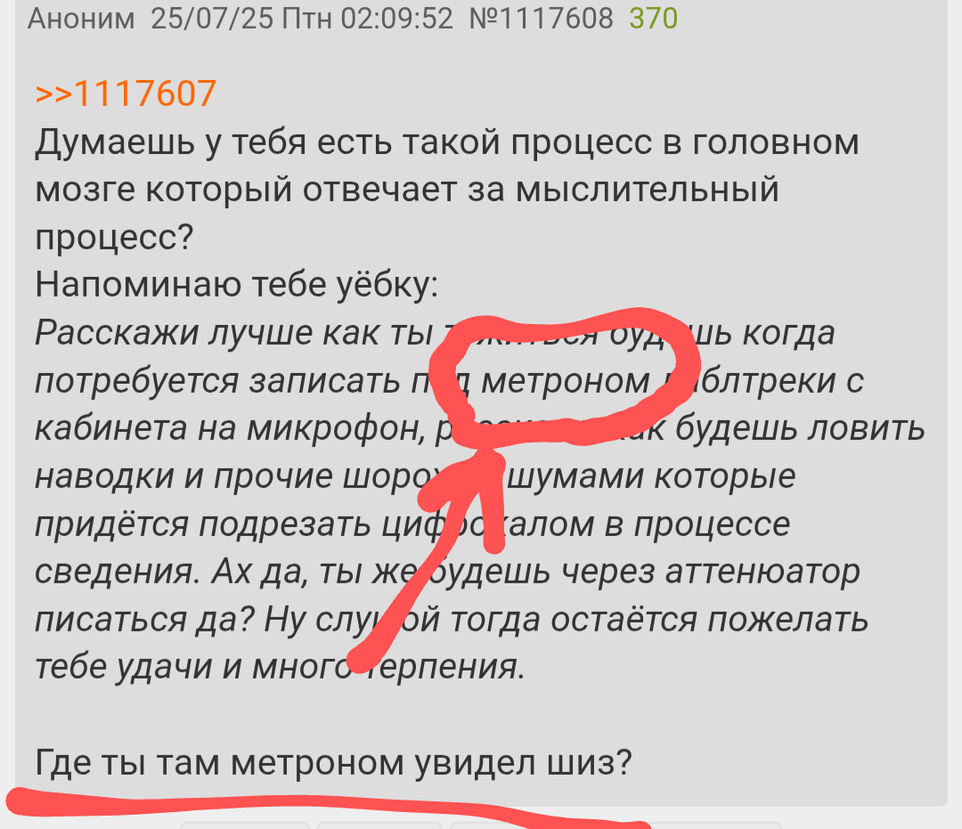 >>1117167 >Короче говоря балбес, вместо обесценивая чужого времени и возможносте Так это ты хуесос тупорылый обесцениваешь мои знания. >ряяя вст-кал крутаа Иди нахуй уже. >создавая треки на которые захотят ровняться цифрокалычи Я кажется тебе уже сказал, что я пока не пришёл к созданию полноценных песен. Или тебе надо как свинье трижды повторять? >которые совершенно похуй звукарям на студиях Ты тупая свинюка, которая выдумывает факты. Спроси у любого, кто занимается работой с живой драмкой. Он тебе расскажет, что запись начинается с создания индивидуального звучания. Приходит группа на студию и несколько дней отстраивает микрофоны и звук так, как ей нравится. И только потом записывается. >шедевр записанный на коленке в подвале используя диктофон телефона Так это и есть индивидуальное звучание. Если в каком-то конкретном случае оно достигается за счёт телефона, то окей. Я знаю одного классного исполнителя, который тупа в подвале на два микрофона пишет акустическую драмку, жоска её перегружая, и получается заебись. >Использовать при этом можно то, на что хватит денег в плане гитары Нет, долбоёб. Так не работает. Ты берёшь не то, на что у тебя хватает денег, а то, что тебе подходит. Цифрокал подходит только чтоб создать унифицированную проходную хуиту для тупых нпс. Нейроночкой закинься - та же шняга получится. Если ты не создаёшь уникальный стиль, то ты идёшь нахуй.