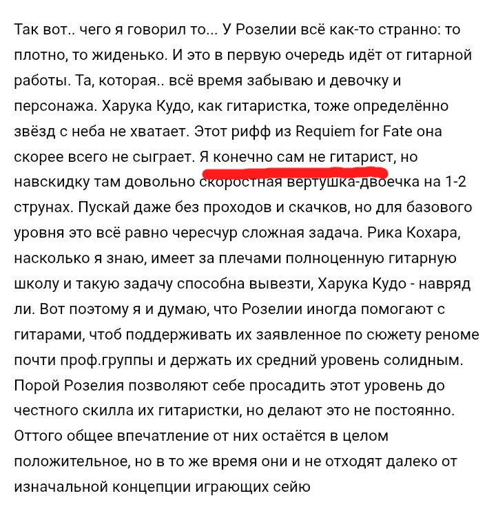 >>1137058 я начинал именно с роксмита, ещё с самой первой версии, через сраный кабель - хорошее начало, но есть много минусов: -задержка, в будущем будут проблемы с синхронизацией левой и правой руки, проблемы с таймингом вцелом -гитарный звук усилителей - тут проблема довольно корневая, это неочевидно, но гитарный звук - довольно комплексная штука, она состоит из гитариста, электрогитары, усилителя, кабинета и микрофона. любое звено может стать слабым и в итоге вся цепочка ломается. в роксмит пусть и задумывается идея Tone Designer, но исходя из своего опыта скажу, что обычно впадлу что-то крутить и ты привыкаешь лениться и просто выбираешь песню и играешь, даже не задумываясь о том, как выглядит цепочка звука, из-за этого ты просто бездумно бренчишь, не зная - сколько гейна у тебя, стоят ли компрессоры и из-за этого вместо вдумчивого и контролируемого звукоизвлечения получается лотерея, ты не понимаешь отклик от инструмента. например играешь одну песню с пресетом под неё и со всей дури лупишь по струне и всё это пережато компрессором и звучит ровно, и на другом пресете еле елозишь по струне и каждое касание струны издаёт громкие звуки.