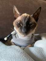 На данный момент состояния нормальное, лежит, чиллит у меня на животе, мурлыкает и пытается лезть поближе к моему лицу, нюхает его и потом кладет лапы на шею.