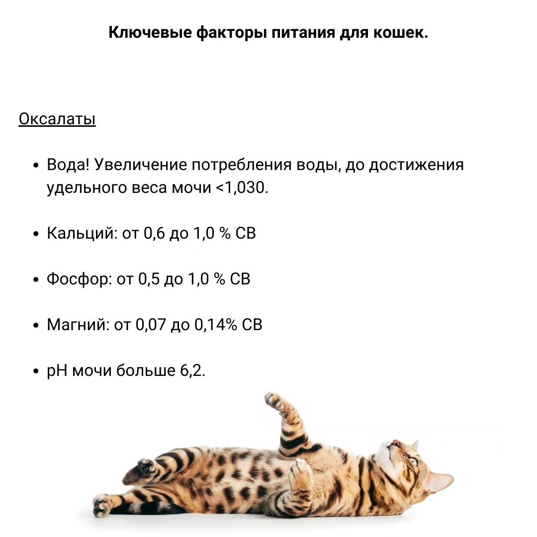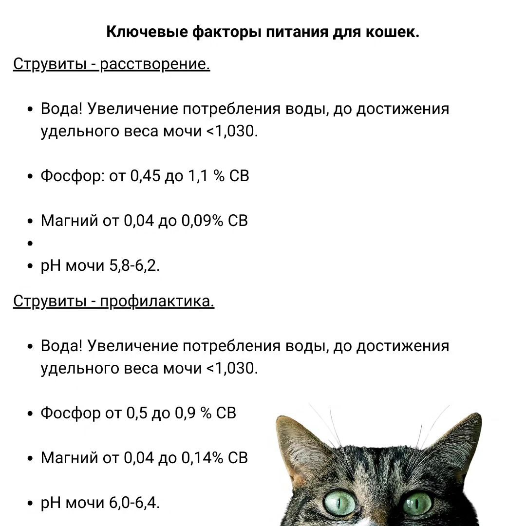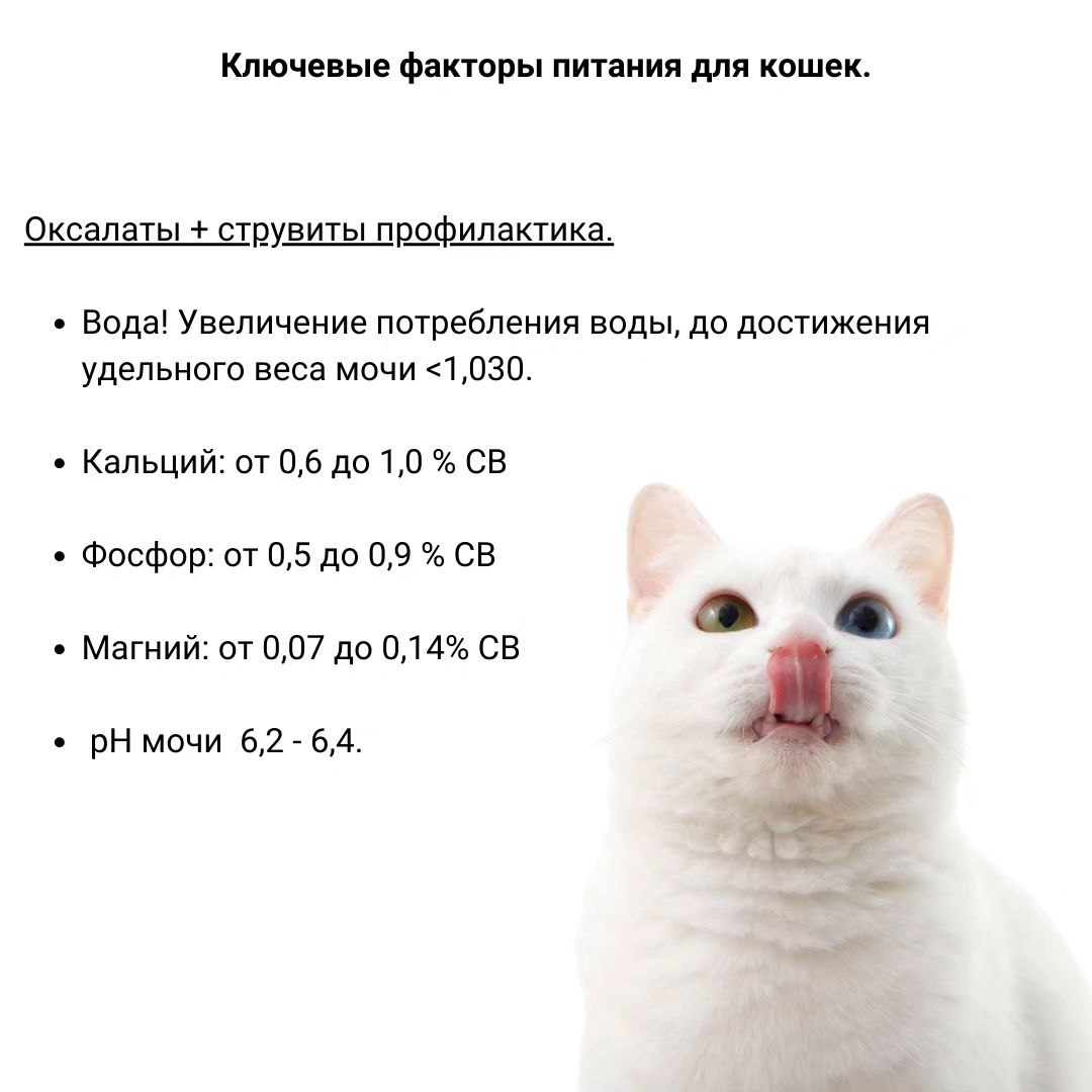Кормление Опасные продукты: шоколад, авокадо, виноград, рыба с костями. Опасные в долгосрочной перспективе: печень, жирные продукты, рыба. Опасных продуктов очень много, стоит сконцентрироваться на том, что кошке можно. Неоднозначные продукты: 1. Коровье молоко - кроме того, из состава которого убрали лактозу. Может привести к серьёзным последствиям. А может и не привести (как повезёт, во многом зависит от организма кошки, перестанет он усваивать лактозу или нет). Козье молоко и _коровье молоко без лактозы_ можно давать, но если это не будет вызывать проблем с пищеварением. Однако есть мнение, что в целом молоко вносит дисбаланс в кормление, и стоит его избегать. Сам пришёл к выводу, что стоит давать что-то околомолочное только первые несколько месяцев (до 4+-), и только специальную покупную смесь для котят. В крайнем случае - козье молоко, но тут на Ваше усмотрение. Если кошка отрыгивает после него - то точно не стоит. 2. Любые другие жидкости, кроме хорошей питьевой воды. /Воду нужно давать не из-под крана, а питьевую. Как правило, если поставить воду подальше от еды, а также повыше (на стол, например), то кошка будет пить воду чаще, гораздо, что полезнее для неё. В идеале оставить на столе специальную чашку, куда наливать воду для кошки./ Чем кормить? Вариант 1. Натуралка, необходимо согласовать всё с профессиональным диетологом, самому лучше этим не заниматься. Этот вариант очень сложный, он для МЕНЬШИНСТВА. Также есть своеобразный вариант инструкции по натуралке, но опять же, правильно - к диетологу,: https://pastebin.com/E62y45jX Вариант 2. Качественный (с хорошим составом, как правило, это определяется в первую очередь отсутствием зерна, злаков и т.п.) корм. Либо сухой + жидкий (можно разных марок), либо только сухой. Можно иногда давать что-то "со стола", например, сырое мясо, курицу. Смысл еды "со стола" в таком случае? Пожалуй, отсутствует. Как выбрать сухой корм? Опирайтесь на: 1) feedsmart.ru; 2) то, что Вы видите в магазинах, доступных Вам; 3) мнение других, могут подкинуть ноунейм-годноту. Отбирая из feedsmart.ru только то, что есть в ДОЛЖНОМ доступе в РФ, на текущий момент получается Grandorf - как лучший вариант (если назначений другого корма от ветеринара). Составы того, что вижу на полках в магазинах, но чего нет на feedsmart.ru, не лучше Grandorf'а. Однако не так давно появился Grandorf Fresh, его из сухого корма и посоветую к выбору, это тот же Grandorf, но состав на голову лучше. Из жидких - ищите те, где отсутствует зерно, среди них выбираете тот, где больше всего мяса (именно мяса, а не субпродуктов на основе чего-то там). В составе именно так и должно быть написано. Ещё очень важный фактор жидкого корма - его консистенция, насколько он плотный. Из дешёвых вариантов по консистенции самый хороший - Perfect Fit. Из вариантов подороже можно выделить Crave. Есть и ещё более дорогие варианты, как правило, это оверпрайс бестолковый, но есть и годные консервы, например, фирмы Farmina, которые правда теперь в РФ уже поставляются. Менее плотные жидкие корма проще усваиваются, поедаются. Но в целом это очень субъективный фактор, не стоит делать выбор на основании этого. Есть масса историй о том, как, пожалуй, самый плотный из жидких кормов, Purina ProPlan, приводил к запорам. Но это также субъективно. В целом, много кормов категорированные: для стерилизованных, для котят, диетические корма, корма в случае определённых заболеваний, и т.п. Эт