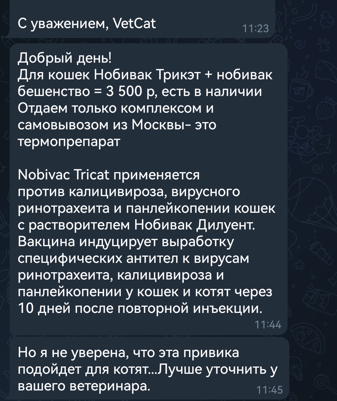 Вакцинация Вакцины: + комплексная (панлейкопения, калицивироз, ринотрахеит), + бешенство, + лейкоз (для бывающих на улице), + также существует вакцина от парникового кашля Ещё бывают от хламидиоза (может входить в комплексную), ВИК и FIP, но они не имеют смысла из-за низкой эффективности и кучи побочек. Также считается, что порядка 30% кошек являются non-responder (имеют иммунитет к вакцинам, т.е. для них вакцины бесполезны). График: В 2 (3/4) месяца — комплексная, через 3-4 недели повтор комплексной + бешенство. В 6 (7/8) месяцев — комплексная однократно (вместо 12 в прежних рекомендациях), далее каждые 1-3 года. Бешенство — через год после первой, независимо от комплексной, далее раз в 3 года (или чаще, в зависимости от законодательства страны и этикетки на конкретной вакцине). -- Однако этот график не столь однозначный, но написанное является в должной мере усреднённым значением разных (по сути, не слишком-то далёких друг от друга мнений по срокам вакцинации). -- Лейкоз (прививаем всех гуляющих) — только после двух тестов на лейкоз. Первый раз не раньше 2 месяцев, с повтором через 3-4 недели, затем через год после первой, далее раз в 3 года (или чаще, в зависимости от плотности общения с уличными). После 7 лет развивается устойчивость к возбудителю. Места инъекций (рекомендации обусловлены риском постинъекционных сарком у кошек и нарушаются большинством клиник из-за незнания и технически сложной реализации): • комплексная — в правую переднюю лапу, избегая межлопаточного пространства; • бешенство — AAFP/AAHA рекомендует вводить препарат как можно дистальнее (ближе к концу) в правую заднюю лапу; • лейкоз — как можно ниже в левую заднюю лапу. Как комплексную вакцину адекватные веты рекомендуют Нобивак, а про Мультифел и Биофел затирают, что это очень слабые вакцины. Спасибо за санкции, так выбор был бы больше.