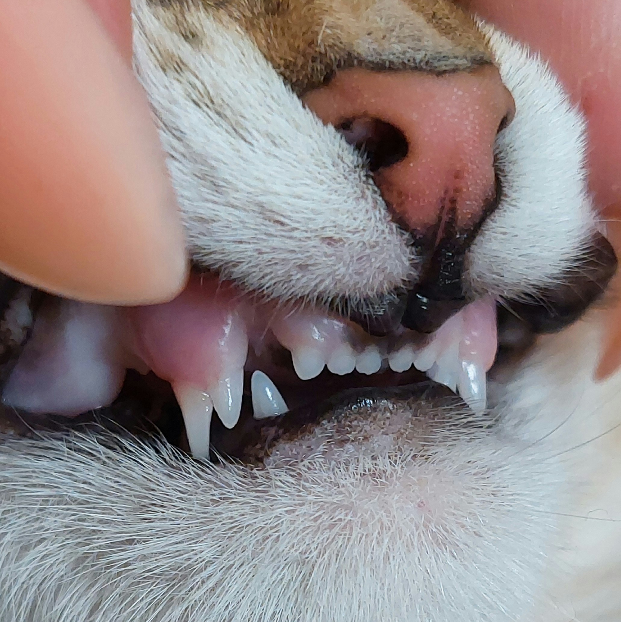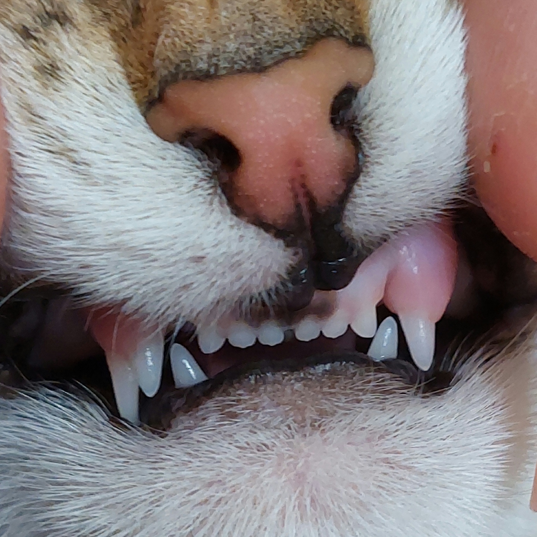 Сос! Меняются зубки у котенка (4-5 мес, точно не знаю, нашла на улице) и я видела, что у неё два клыка. Я думала, что у всех кошек два клыка с обеих сторон, но погуглила и поняла, что нет.