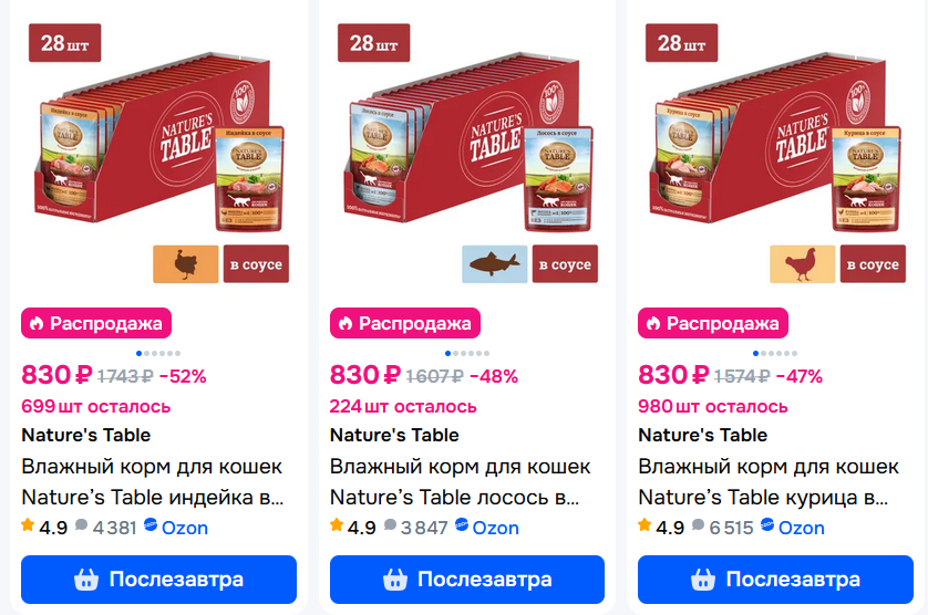 ### 💡 **Кому подойдёт Nature's Table?** - Владельцам, которые хотят **уйти с Perfect Fit/Whiskas**, но не готовы к Purina Pro Plan. - Для **здоровых кошек без аллергии на кукурузу/курицу**. - Если нравится ассортимент (есть корма с уткой, лососем, кроликом).