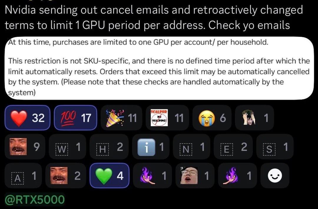 Компания NVIDIA радикально пересмотрела политику продаж в своем официальном магазине, начав активную кампанию против перекупщиков. Теперь действует строгое правило: покупка ограничена одной видеокартой на аккаунт или домохозяйство. Представители компании начали массово рассылать уведомления об аннулировании заказов, которые нарушают новые условия, причем правила применяются задним числом даже к уже оформленным покупкам дефицитных карт серии RTX 50.