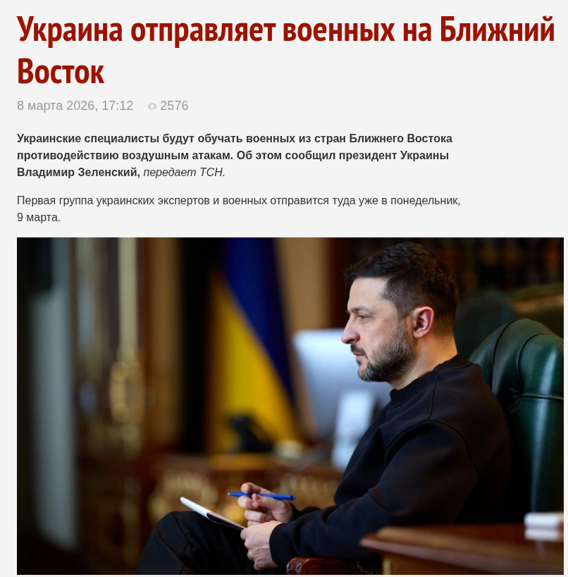 Зеленский же ранее сообщил, что первая группа специалистов по БПЛА отправится на Ближний Восток в понедельник, 9 марта. По его словам, украинские эксперты будут учить военных стран Персидского залива, как сбивать дроны.