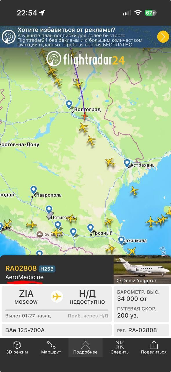 23.07 Аero medicine из Москвы вылетел. Конечная точка не указана. Но летит вниз как будто к чечне