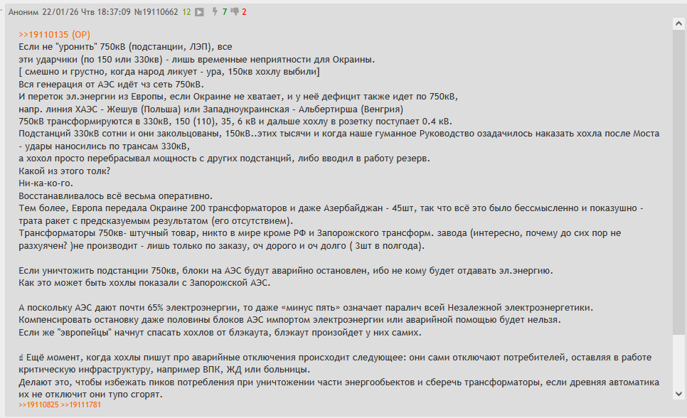 Так вы не на сосаче эти вопрос задавайте, а редачьте пасту в человеческий вид и спамьте предложением на kremlin.ru Либо примут к сведению, либо овтетят вам мням почему мням не дрониливали подстанции раньше