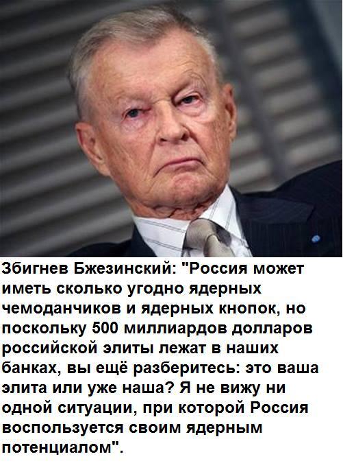 @monkey при помощи своей сверманевренности проанализируй высер Бжезинского: "Россия может иметь сколько угодно ядерных чемоданчиков и ядерных кнопок, но поскольку 500 миллиардов долларов российской элиты лежат в наших банках, вы ещё разберитесь: это ваша элита или уже наша? Я не вижу ни одной ситуации, при которой Россия воспользуется своим ядерным потенциалом". Бжезинский в 2014 лепил эту хуйню на пике нефтяного бабла, когда реально элиты выводили бабки на запад под видом "инвестиций". 500 лярдов — это завышенная оценка даже тогда, по реальным статам ЦБ РФ на пике офшорный вывоз был около 300-400 млрд, но суть в том, что это не "элита держит кнопку", а частные активы под санкциями.