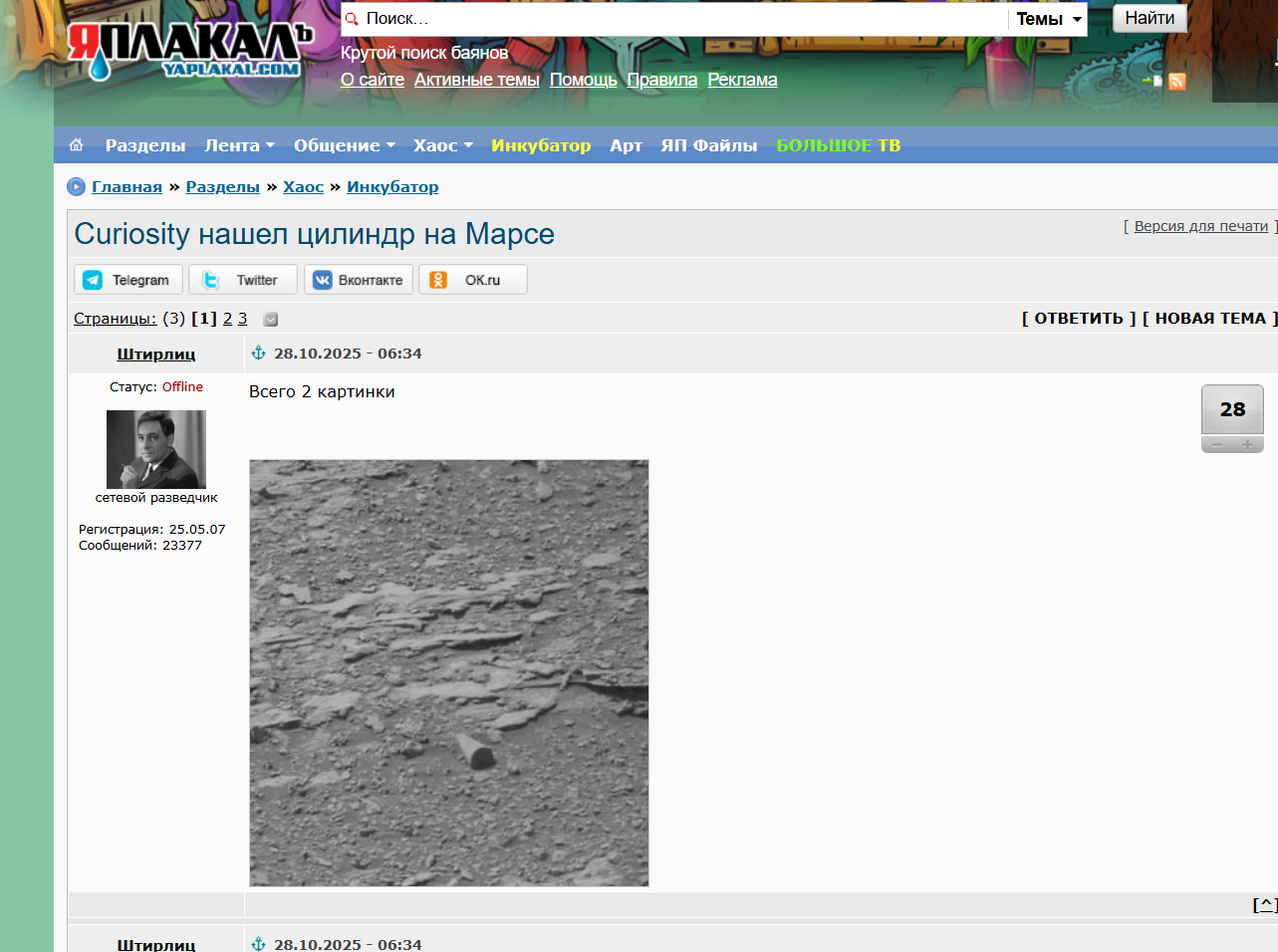 Ави Лёб (Abraham Loeb) из Гарвард-Смитсоновского центра астрофизики (Harvard Smithsonian Center for Astrophysics) — тот самый, чьи подозрения в том, что межзвездный пришелец 3I/ATLAS может представлять из себя космический корабль инопланетян, на днях всколыхнул новые подозрения. Ученый призвал NASA внимательнее присмотреться к находке, которую марсианский робот «Любопытство» (Mars Science Laboratory Curiosity) сделал еще 4 года назад. В 2022 году его камера на штанге (Mastcam) сфотографировала объект удивительно правильной геометрической формы — какой-то небольшой цилиндр, зарывшийся в грунт. Внимание Лёба к нему привлекли отнюдь не виртуальные археологи — энтузиасты, которые фанатично выискивают нечто странное на снимках с Марса и Луны и, на удивление, находят объекты, явно не соответствующие научным представлениям о соседних небесных телах. Как-то: нечто явно рукотворное, но не земное.
