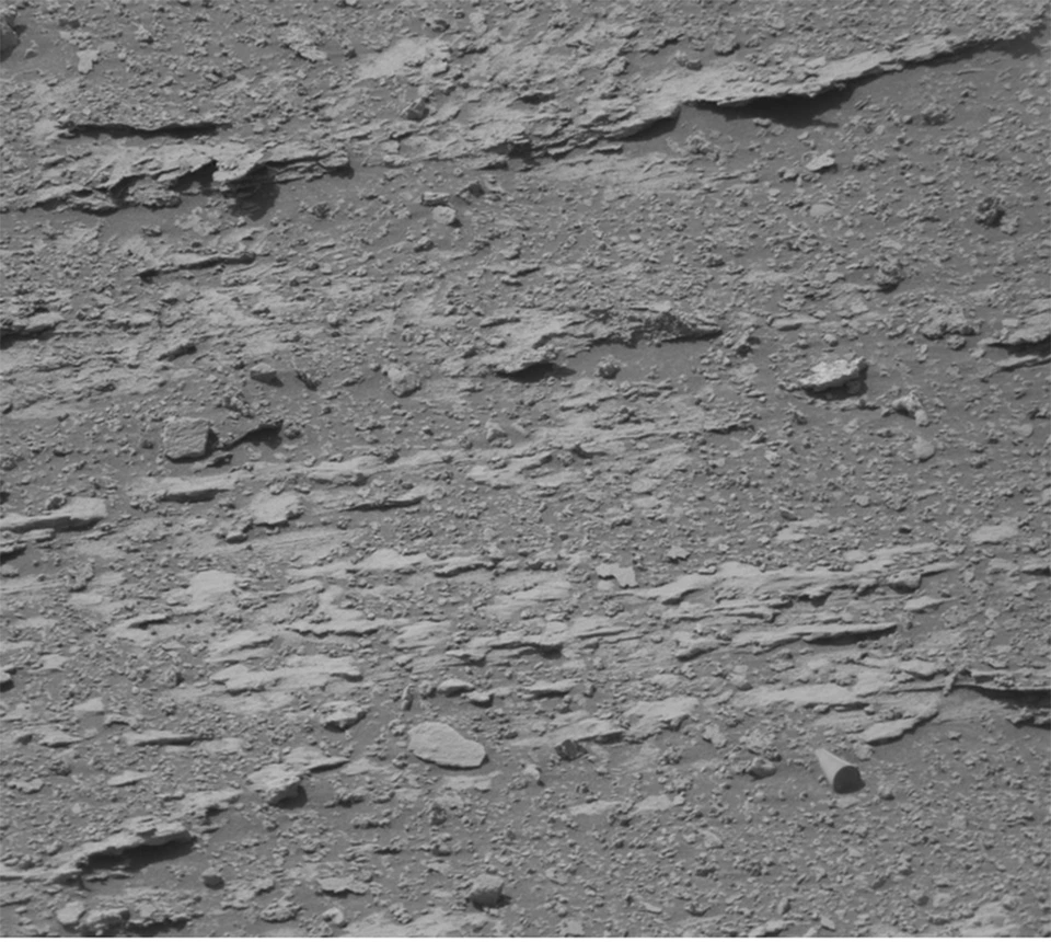 Размер цилиндра — около 20 сантиметров. Торчит из марсианского грунта, чуть скрыт в нем. От этого выглядит усеченным конусом. Не похож на деталь, которая могла отвалиться от самого робота. Или от какого-нибудь спускаемого аппарата.