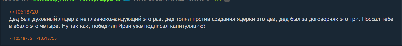 >>1727243 Ну бля, вот говорят, что аятоллу в Иране грохнули и вообще почти всё высшее руководство. Если правда, то высокоточка хорошо сработала здесь. Теперь поставят "своего", который будет делать всё, что прикажут. Почему нельзя было сделать так же на Украине? Я хуй знает. Америка не потеряла ни одного солдата, въебали красиво и зрелищно. Россия же хуярит мясом своих солдат уже пятый год.