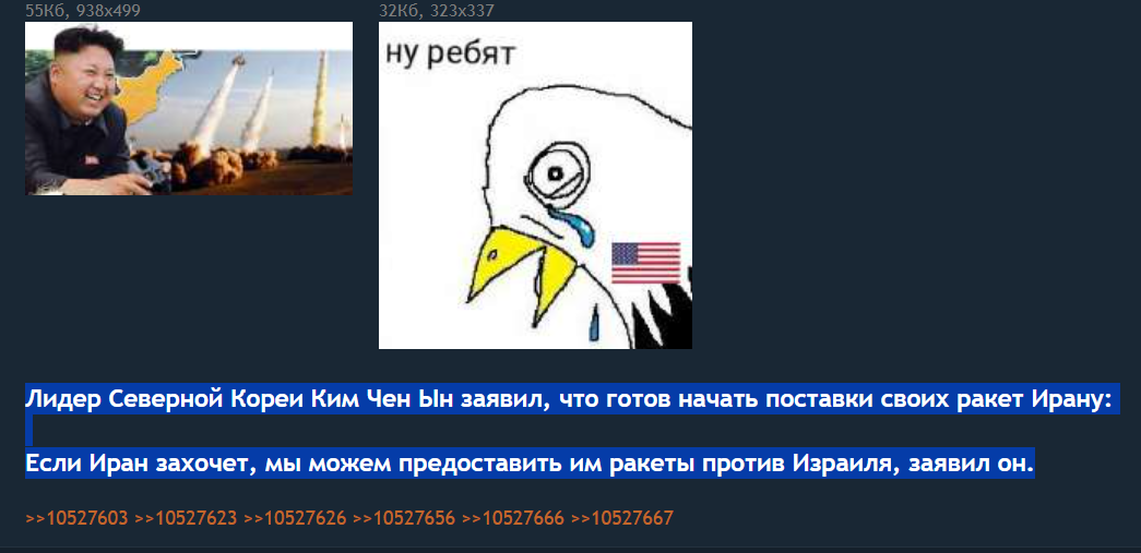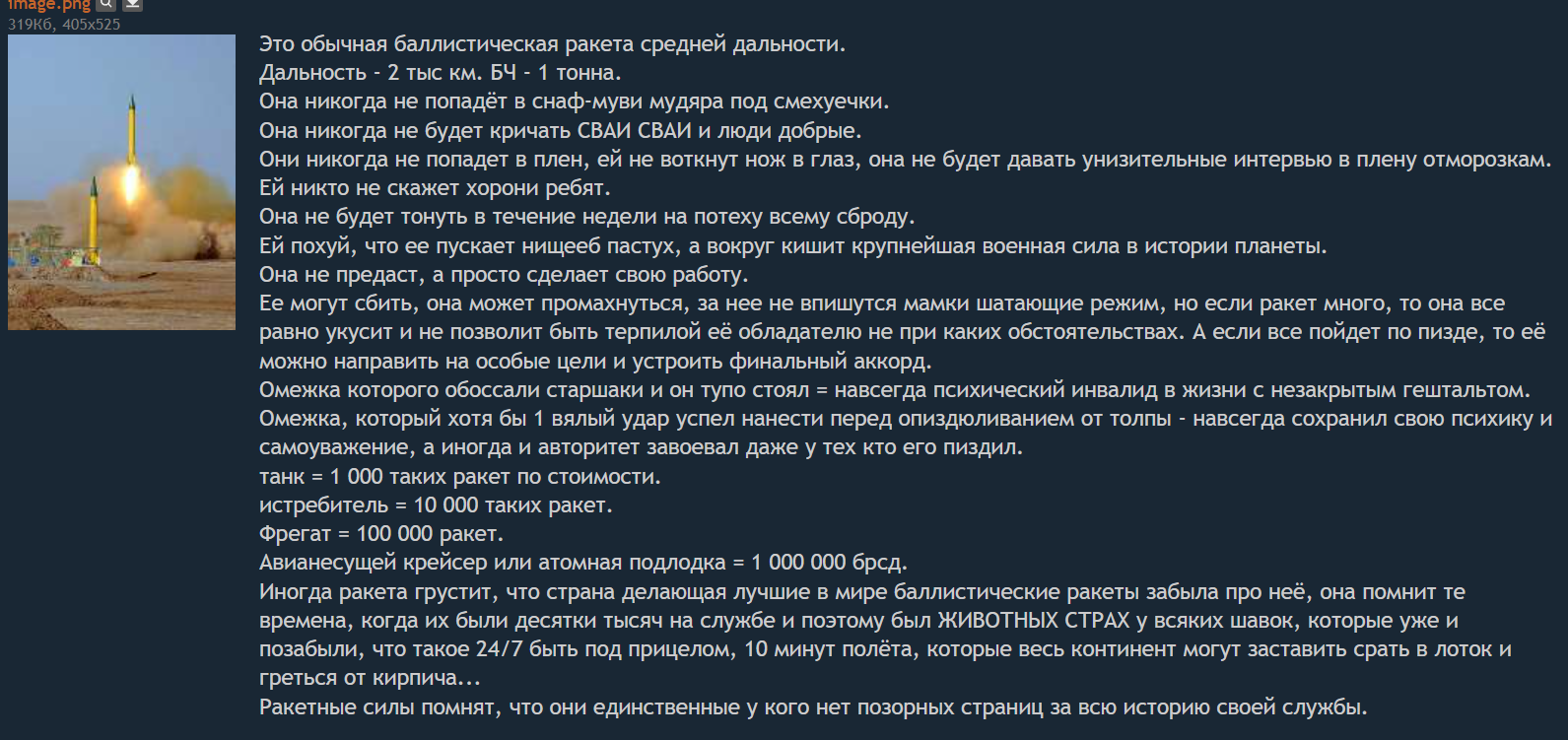 >>1727238 И - знаете! Это - ключевой момент! Даже если сейчас, Иран, с помощью хитрых умов России и Китая сможет преодолеть этот кризис, с помощью своих конвенционных ракетных програм.... Его добьют. Сегодня опять и снова, нанесут СУЩЕСТВЕННЫЙ УРОН - но он выстоит. тУТ уже, в принципе - понятно. Всё произойдет - как и 8 месяцев назад. Похуярят друг друга ракетами - а потом мир-мир-мир. Который нихуя не мир, конечно же. И тогда у Ирана - останется только один выход. Только один. Как бы - кто его не хотел. Иран произведет первые испытания ядерного оружия. несмотря на то, что Аятола принял за Харам - ЯО. Другого путя нет. Ну нет просто. Так что. Встречайте новую Ядерную Державу - Иран! Моя вероятность вероятна просто на 80%.