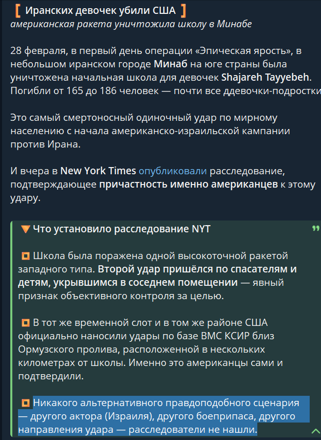Ну чтож. Подходит к конку 3й день Американо-Иранской войны. Можно уже подводить итоги. Если коротко - Иран молодцом! Если длинно - за 8 месяцев не было предоставлено нужное количество пзрк Верба со стороны РФ, поэтому жыды литают на беспилотках и бомбят пусковые. Пока набомблено не много, можно сказать что и не критично. Аятола со всей семьей пожертсовал себя - всем похуй. 150 девочек убили американци - всем похуй. Никто не думал, что самый ебанутый народ - иранцы - готовы сдохнуть ради веры. Всех переплюнули. Шанцы на продолжение войны - равные. Или РФ всё же в срочном порядке предоставит Вербы в нужном объеме для уничтожения Гермесов, или жыды задавят беспилотками пусковые Ирану. План Рыжег пошел по пизде - с наскока взять не получилось - экономический ущерб уже слишком большой. Прогнозы положительные. Кто-то всё же доставит в Иран ПВО в достаточном количестве - другого быть не может. Из закромов достанут. И тогда война продолжится и базы ФШП будут гореть. Жаль, сегодня до конца 3его ожесточенного сражения досидеть не могу - завтра работать всё такое.. Эх! Хоть отпуск бери!