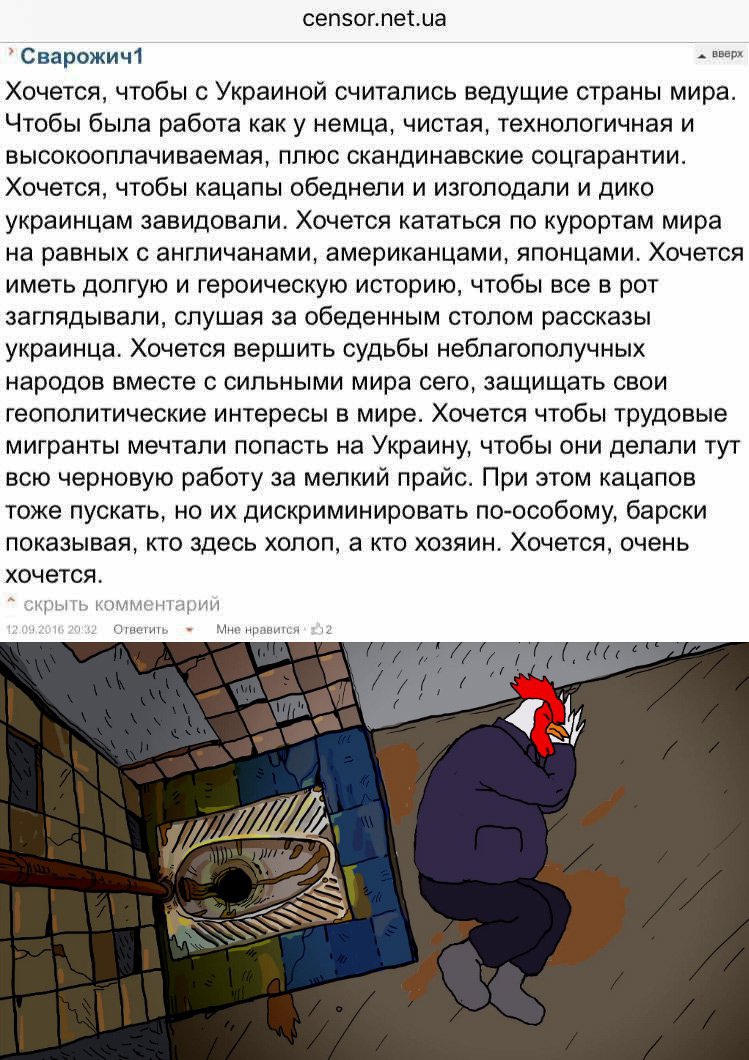 >>1671953 >Родина тебе неприятна, ты не то что долги гражданские не хочешь отдавать, а даже находиться в ней, ты косплеер. Ты реально походу не понимаешь как люди в свободном мире живут. Еще и выводы ошибочные делаешь на основе флажков на дваче, думая что у всех, как у тебя чёрно-белое мышление. Буквально образ мыслей "Где жопе теплей там и дом". Представляешь, люди за границей твоей страны живут там где хотят, ездят, путешествуют. В Испании например куча голландцев живёт, немцев, англичан. Они тоже косплееры? Косплеят испанцев все поголовно, да? Переехали на Пиринеи наверное из-за того что им Родина неприятна и долги не хотят отдавать))) >>1671954 >ВСЕРЬЁЗ СЧИТАЮТ, ЧТО С НИМИ ГОВОРЯТ. Один из гулага хрюкает, второй, если не под впн, из коморки уборщика сортиров. Пишут, как им кажется, аргументы, пыхтят, кидают предъявы. Думают, что ведут диалог, кек. Хотя диалога-то нет, с домашним скотом диалогов не ведут. Всё так. Я этот тред воспринимаю как пикрил - нормальные люди приятно общаются, но время от времени прибегает какой-то невопитанный крестьянин и начинает что-то требовать/фантазировать/говорить еще и с гонором. На таких можно лишь снисходительно смотреть, ну либо с отвращением, в зависимости от их уровня вежливости и интеллекта. Я вообще заметил что за 30 лет незалежности в украинцах выпестовали такие качества как показушная невоспитанность, бахвальство отсутствием субординации, банальное хамство, еще с привкусом такого деревенского вайба и возведённое в культ. Они ничего не видят кринжового например в таком вот перфомансе гопника: >>1668890 Более того, они эту гопоту пестуют и выбирают на выборах. И гордятся потом своим выбором. Смотрят такие видео и думают "Якось наш хлопчик ентому хородскому москалю показав! А! Пущай вучит мову, коли хоче життя в Украинi!!!!" То есть 0 кринжа. Или зайти в парламент в сельской рубахе с вышивкой, будто ты аниматор в детском садике, а не министр. Или на приём к американскому президенту ворваться в футболке, показательно наплевав на протокол. От таких действий смердит безкультурьем, это буквально хамство. Но что для всех людей хамство и дурной тон - для украинца - повод для потужной гордости. Это примерно похоже на то как деревенские задирали городских, отправленных при советах собирать картошку в колхозы на лето, такой же вайб.