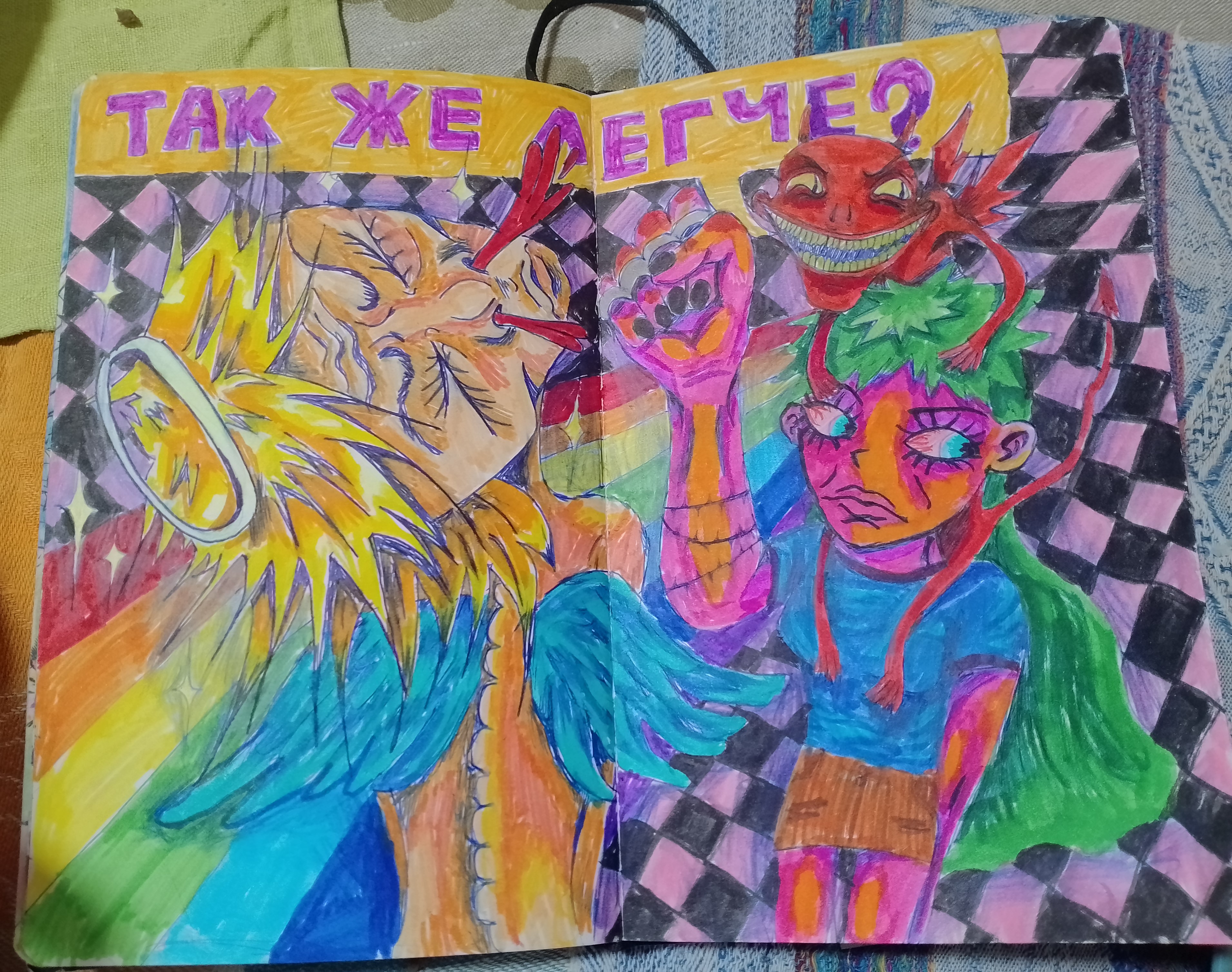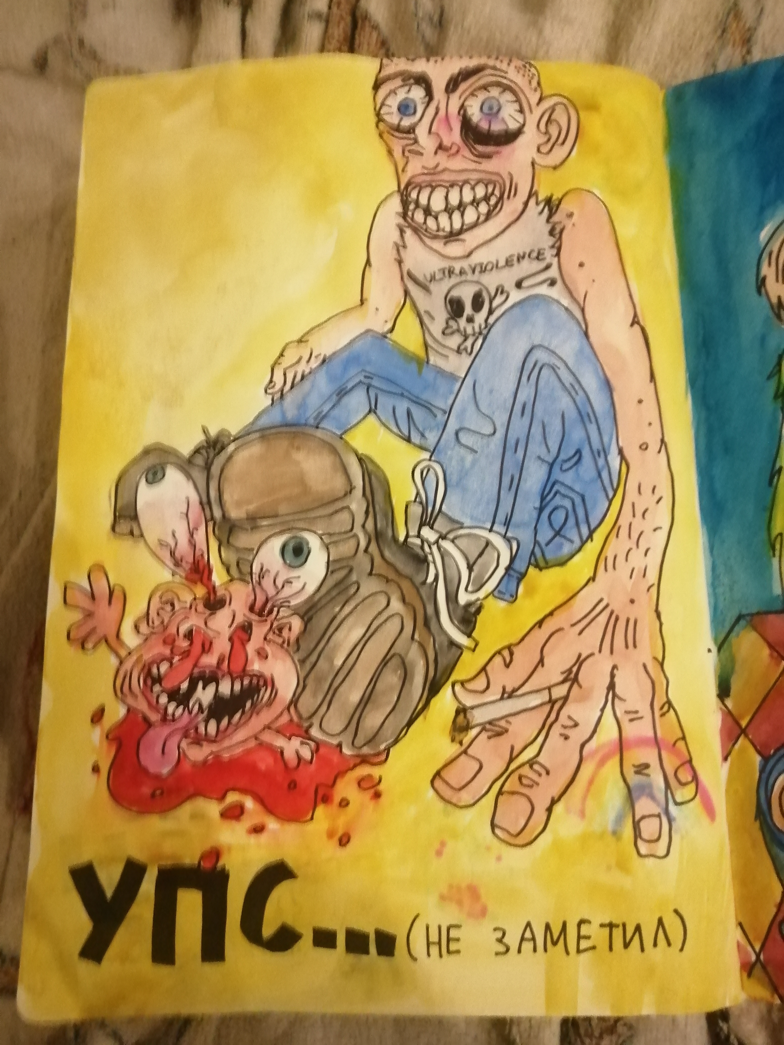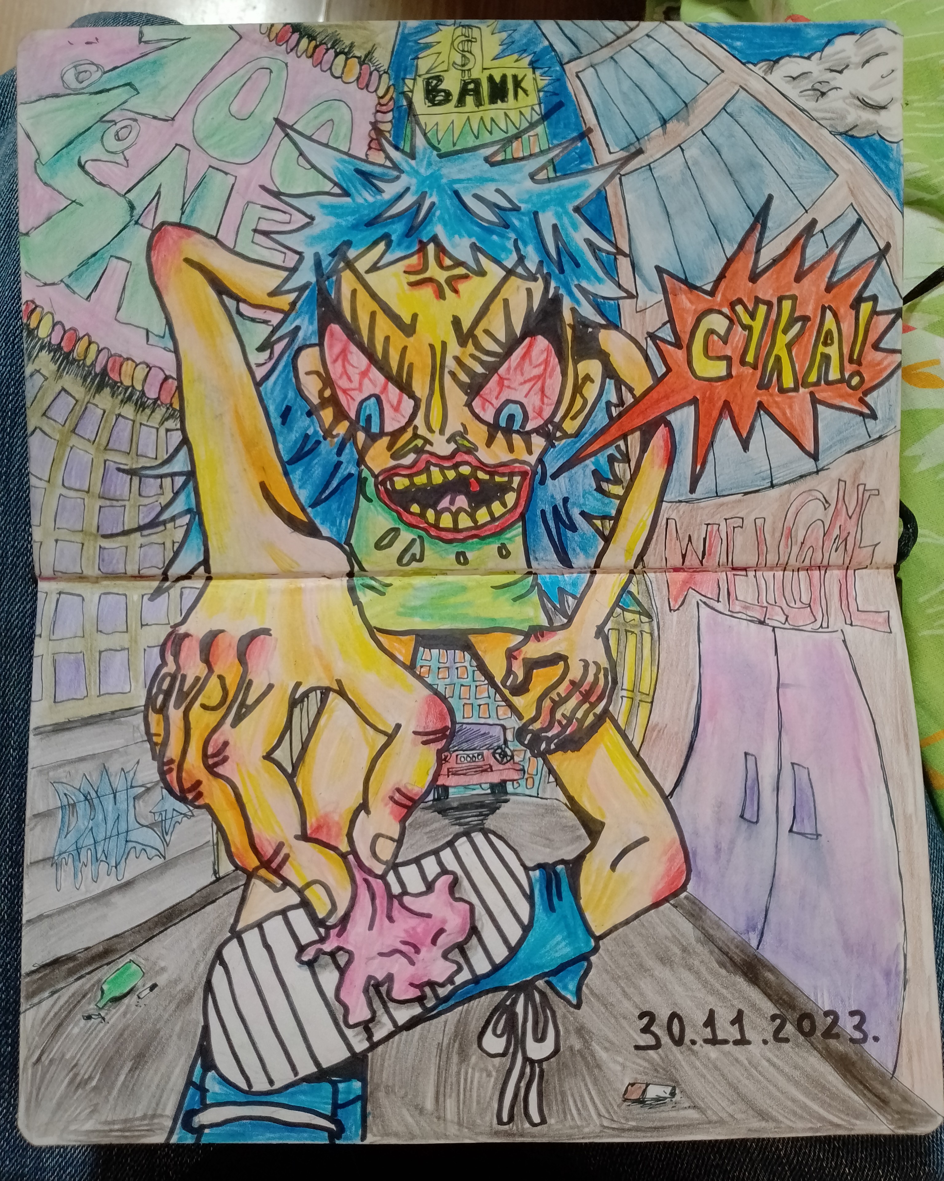 Сейчас отойдя от темы наркотиков, насилия и секса очень сложно найти далее свой творческий путь, интересных сюжетов как будто нет, а бытовуху рисовать я ненавижу, но это единственное сейчас чем я живу: учёба и быт. Не хочу возвращаться к жестокости и прочим гадостям, неактуально на данный момент для меня. Пытаюсь экспереминтировать с техниками, перейдя на большой формат и заменив карандаши с фломастерами на краски и графику. Неимоверно сложно найти в себе и вокруг что-либо цепляющее...