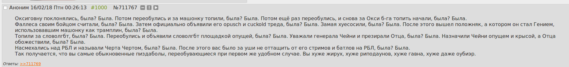 >>110279 >>110276 >>110275 Ой не надо лицемерия. Абсолютно весь хх перебрался сюда, когда тот окончательно подох. Истинных обровцев тут 3,5 калеки. Так что на данный момент хх=обр.