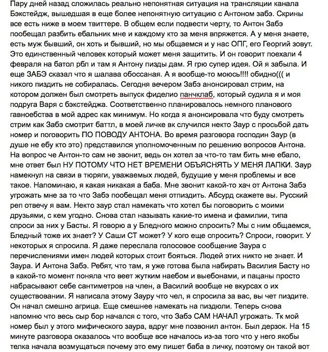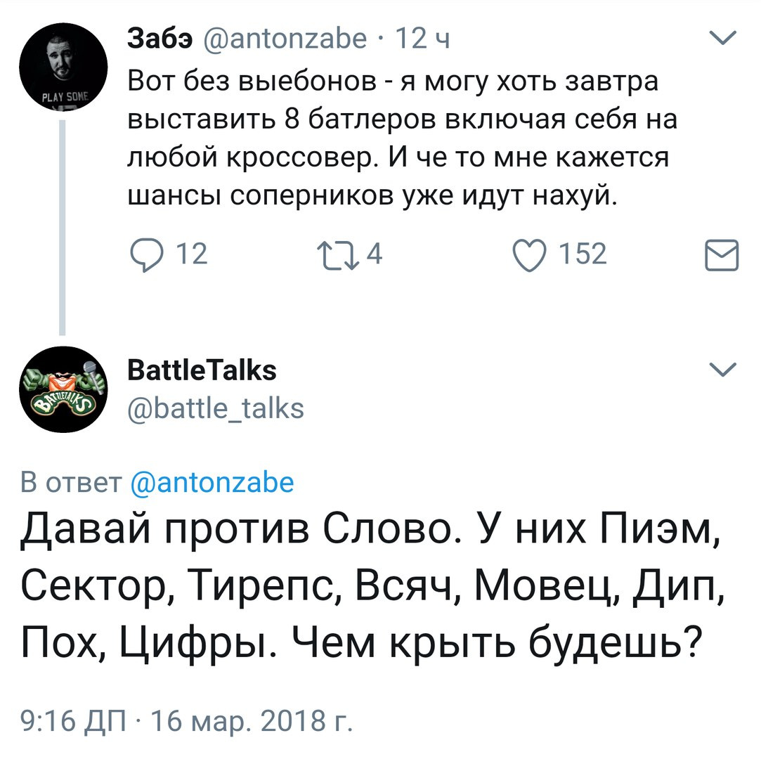 Как забэшка на маниту обиделся: https://youtu.be/hbZ4ZC_cs00?t=6518 1:48:38 - начало 1:56:41 - ответ маниту 1:59:50 - забэшка задело, что маниту написал, что забэ задело 2:05:02 - забэшка угрожает выехать с сектором и наказать белоруса 2:06:35 - полный ответ маниту, чёрт понял, что опущен и извинений не будет и пытается съехать на прикольчиках и послать на ивент своего кореша чтобы тот поговорил с маниту. Как и в ситуации с грязью, все свалил на других