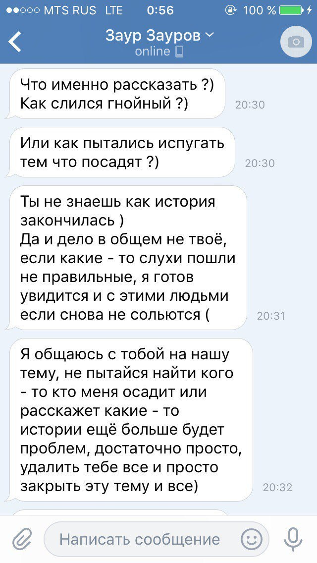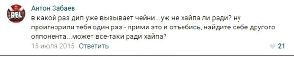 >>172083 Манита сказал что он злобный бородатый планктон, который подохнет от пробития фейспалмов на стриме или как-то так. Забе еще на стриме начал делать вид что хочет спросить за слова, искать его контакты, через хуйшу вроде, манита войсы хуйше слал мол черт че долбоеб к такой хуйне приебываться, в итоге забэ хотел пригласить маниту на стрим или в реале предъявить ему и как всегда съехал. Абба послал забэшку на хуй на стриме потом постиронично извинился и черт сразу "ну все, короче пока"