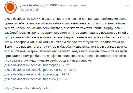 дима бамберг, не ШОКК. я захотел начать с нуля. и для начала необходимо было принять себя таким, какой есть - . наверняка, есть за что меня любить, чем-то, наверное, можно восхищаться, а за что-то хочется набить морду. сами разбирайтесь. мы репетировали все лето и я уговорил пацанов поехать со мной в тур. у меня вообще никаких прогнозов и единственное что я могу обещать - это то, что мы взорвем каждый конц, в каждом городе этого тура: от Владивостока до Берлина. у нас для этого три гитары, барабан и два вокалиста. вы раньше других услышите новые треки потому, что работать над альбомом мы планируем в пути. приходите к нам разбиваться в фарш. вписывайтесь в первые концерты нашего тура уже в этом году. и ищите свой город в нашем списке.