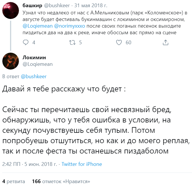 мне в личке кстати обладает пригрозил что спросит за слова об нём и его творчестве. чот ссу теперь(он меня знает через общих знакомых). я его при наших общих знакомых хуесосил немного и мягко и треки его(он мне не нравится).