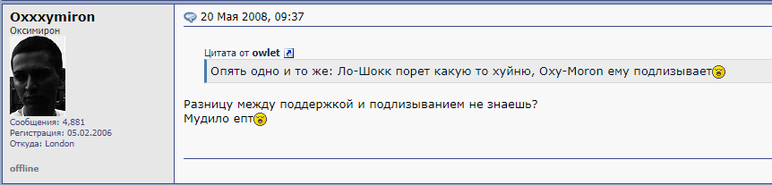 >>190298 >Ну в таком случае если ты так пояснял, то значит Окси и не попс. >Любой квадрат - прямоугольник, значит любой прямоугольник - квадрат. Я понял твою логику, давай дальше. >не хочешь видеть его переоцененность Я физически не могу видеть его переоцененность, потому что вообще нигде (по баттловой теме) не обитаю кроме этого треда. О большинстве явлений узнаю от обрыганов и своего кореша, который усиленно следит за этим пластом + кидает новости в лс. >раунды похожие друг на друга Все так. >Не говоря уже о том что его чуть телка не уделала. Не стоит недооценивать влияние твиттера оксаны на каловые массы. Один твит про то как ему телочка понравилась = +респект от судей. >И что за латентная не здоровая гомо-привычка в стиле щуккиры называть постоянно Мирона певичкой, телкой? Так певичка же. Панчи где? Агрессия? Разбор оппонента? Все это в меру, второй ПеТуХ не нужен. >Если оценивать по заслугам, то Окси должен сразу в финал автоматом проходить. Вишенка на твоем посте. В рамочке святой лик стоит уже? И тут ты, короче, перечисляешь заслуги твоего Бога. Если он так велик, то, должно быть, это не составит большого труда? Если вдруг начнешь - делай без всяких абстрактных высказываний. Говори по факту - альбом трижды платина, N фолловеров в твиттере, N% Поддержки в голосовалке и пр.