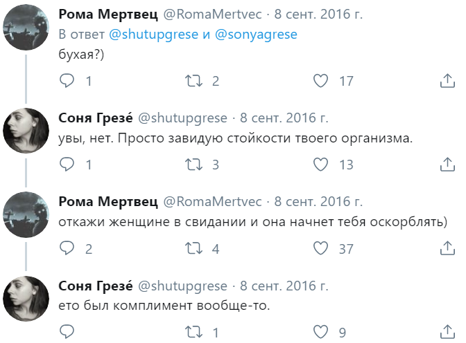 >>190493 Пиздец, судьи возьмут, да и посчитают количество панчей и наш боец виктор слетит, обидно. Но у него есть время увидеть твит и записать полчаса пунчлиний, отборных, как огурцы из азбуки вкуса, которые они с женой покупают, чтобы разнообразить sex ife виктор, извини, что рассказал всем