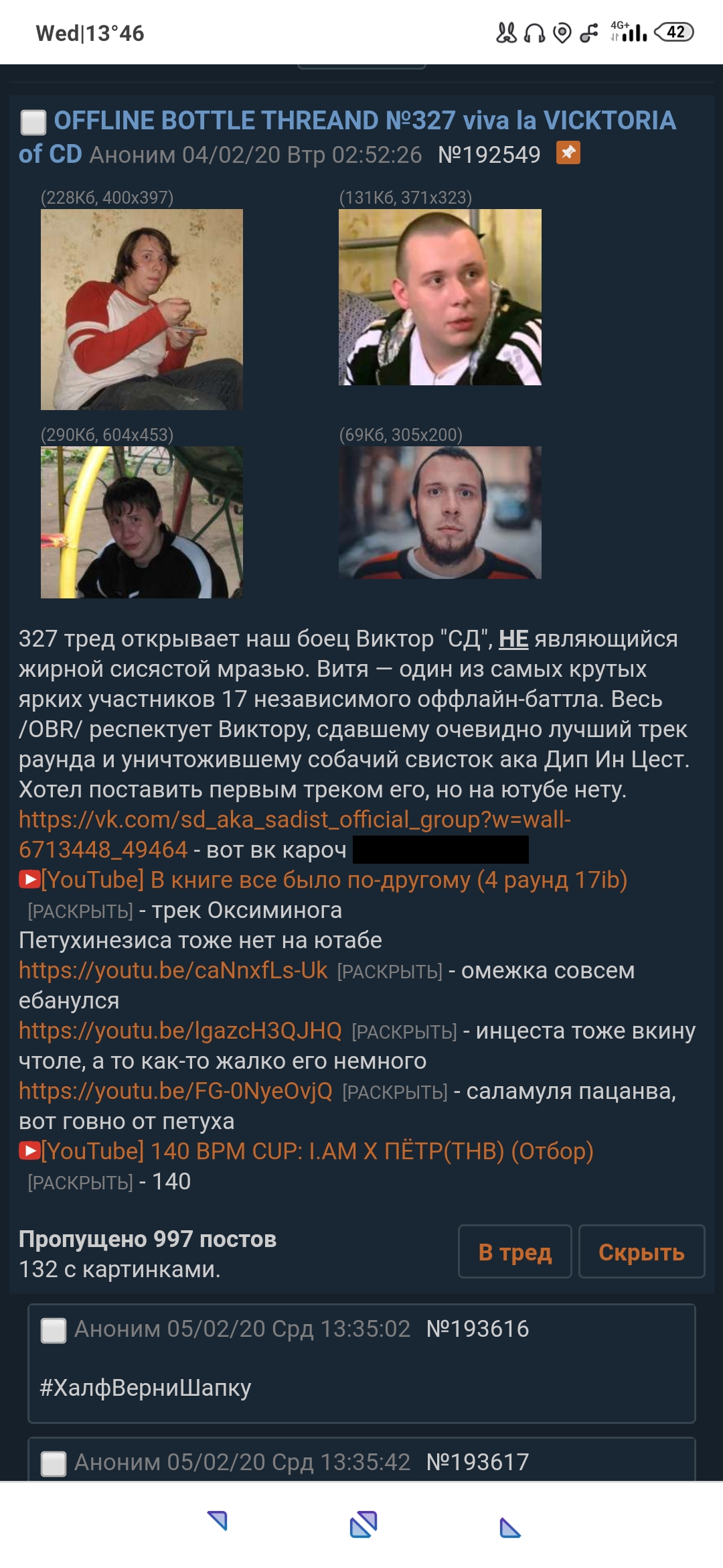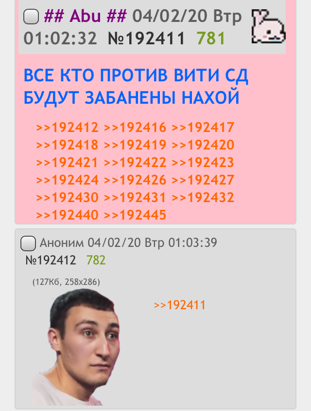 Конкистадор на связи Захожу все так же с утра, днем и перед сном Вижу древние шизы - сразу баню базара нет Составляйте цепочки, я забаню один пост и все остальные исчезнут, если вы правильно выделили - это такая игра: попади в шизика из цепемёта Не перекатываю пушто нахуя? У нас демократия и нет правительства, нет пыни понимаете? Каждый раз Оп-пыней может стать абсолютно новый пользователь! Это ли не идеальная утопия? Если вы перекатили и ваш пост еще можно спасти, подредактировав пару деталей (например как всегда проебались с нумерацией) то будьте уверены - я это сделаю, своих в беде не бросаем Ну а так это забавный экспириенс - 2000 постов в треде Нам по идее вообще перекаты не нужны - все равно я все треды закрепляю, то есть само понятие "бамп-лимит" на обр отсутствует