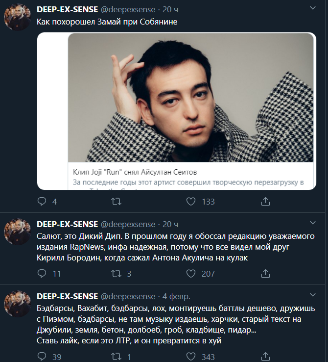>>192708 >ИНЦЕСТ ВЫСРАЛ КАКУЮ-ТО ВЫМУЧЕННАЯ ХУЙНЮ ПРО ТВИТТЫ Ты вторую часть слушал, мань? Там ни слова про твиты, охуенный текст и охуенное звучание. Съебись, подсосам вики здесь не рады