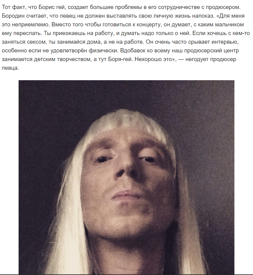 Теперь продюсер Бориса заявил, что он хочет поменять пол и стать женщиной. «У него есть мысли по поводу смены пола. Если он это сделает, я перестану с ним работать. Он гей, а это и так отклонение. Если он станет ещё и женщиной, то будет просить называть его не Борей, а какой-нибудь Натали… Публика перестанет его воспринимать», — рассказал Андрей Бородин в интервью life.ru.